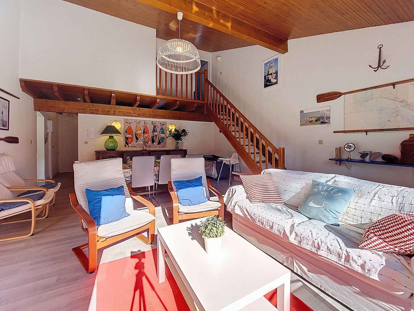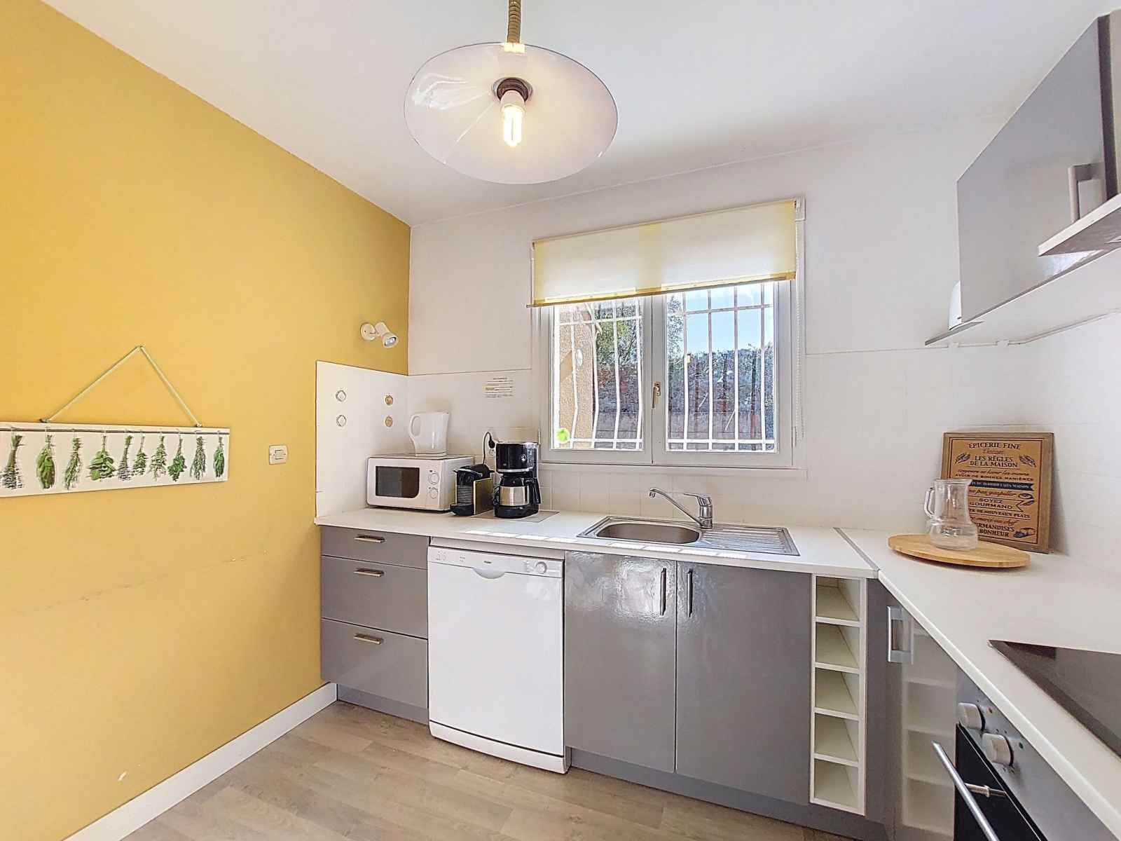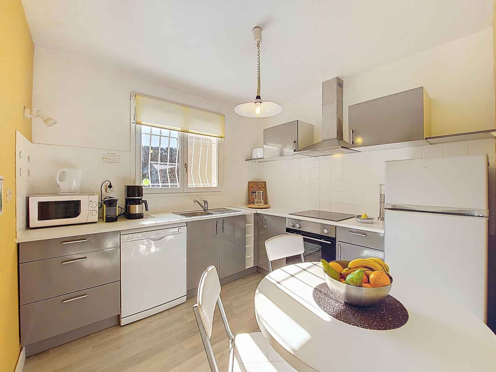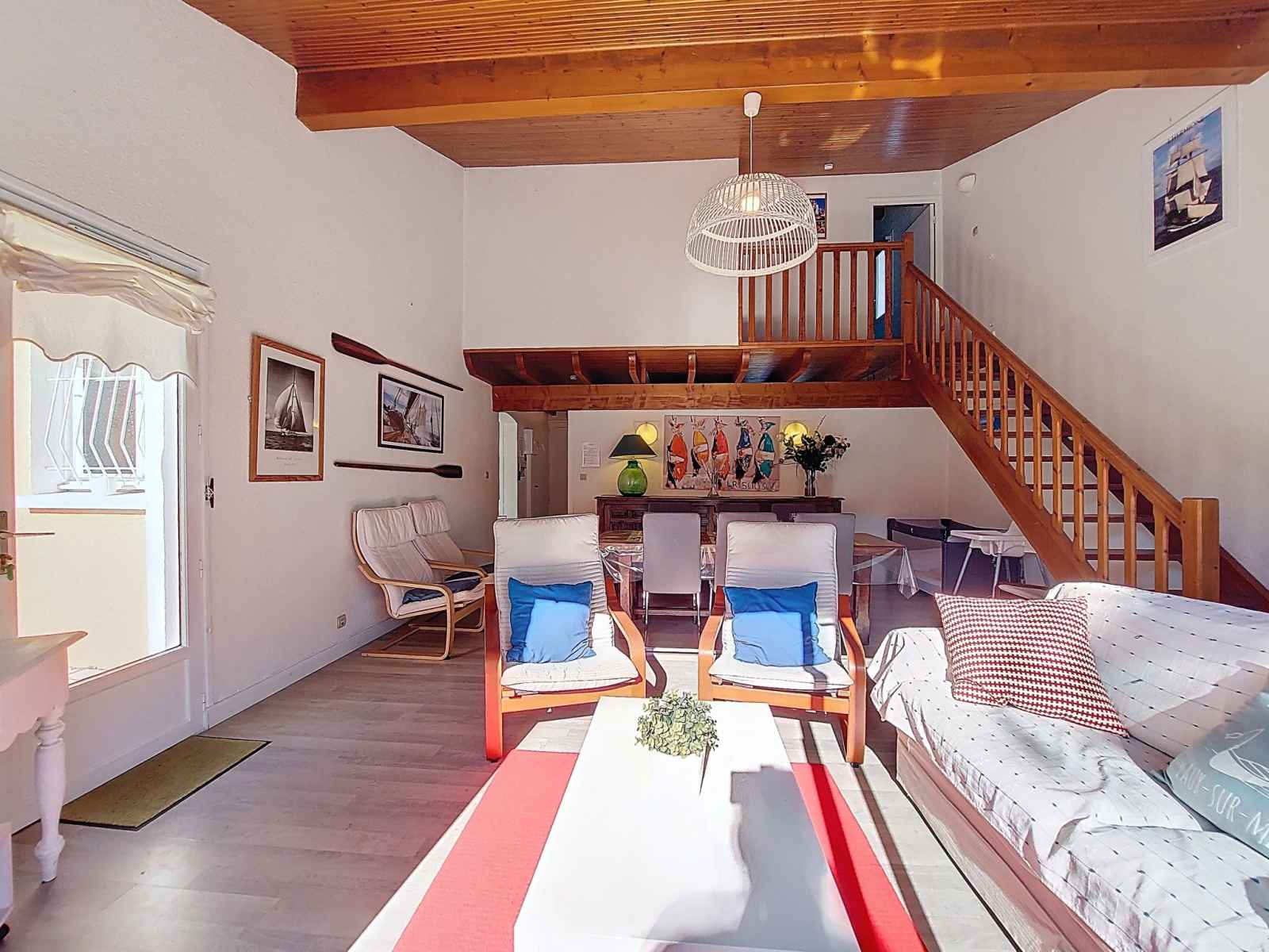 Maison 4 pièces 83 m2 sur 2 niveaux. séjour/salle à manger avec tv (écran plat). sortie sur la terrasse. 1 chambre avec 1 grand-lit (1 x 180 cm, longueur 190 cm). cuisine (four, lave-vaisselle, 3 plaques à induction, micro-ondes, congélateur, cafetière électrique, capsules pour machine à café (magimix) (non incluses)). douche, wc