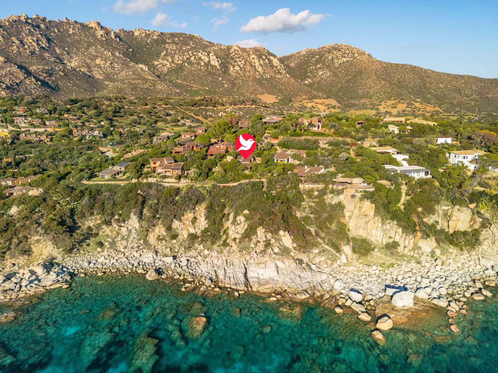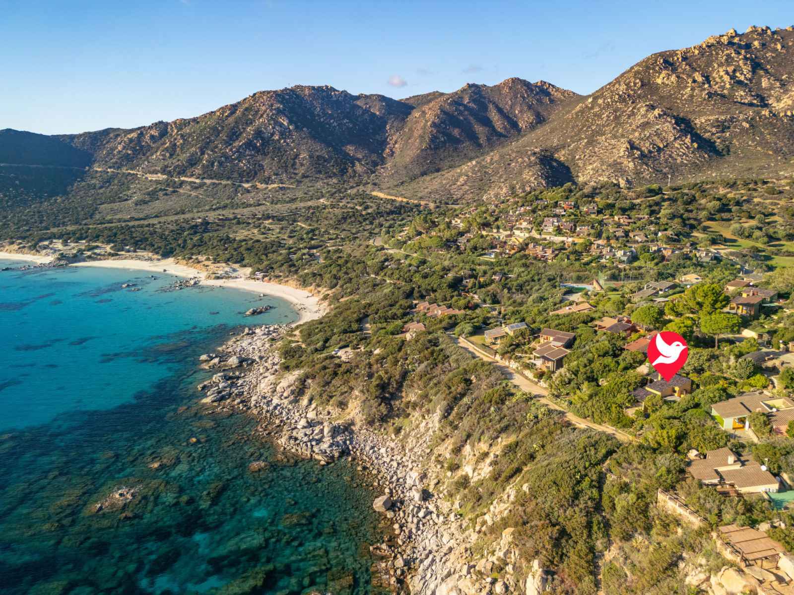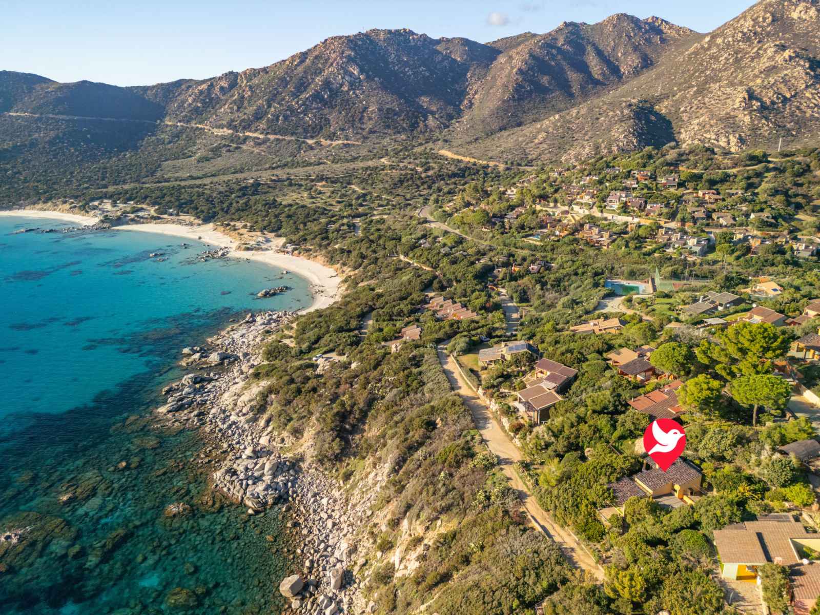 Belle résidence "capo boi", environnée par les arbres et prés. en bordure de la localité, à 6 km du centre de villasimius, à 300 m de la mer, à 300 m de la plage, accès direct à la plage, dans la verdure. a usage privé: terrain (clôturé). accès en voiture par un chemin raide de 500 m de long (chemin non goudronné). place de parking.
