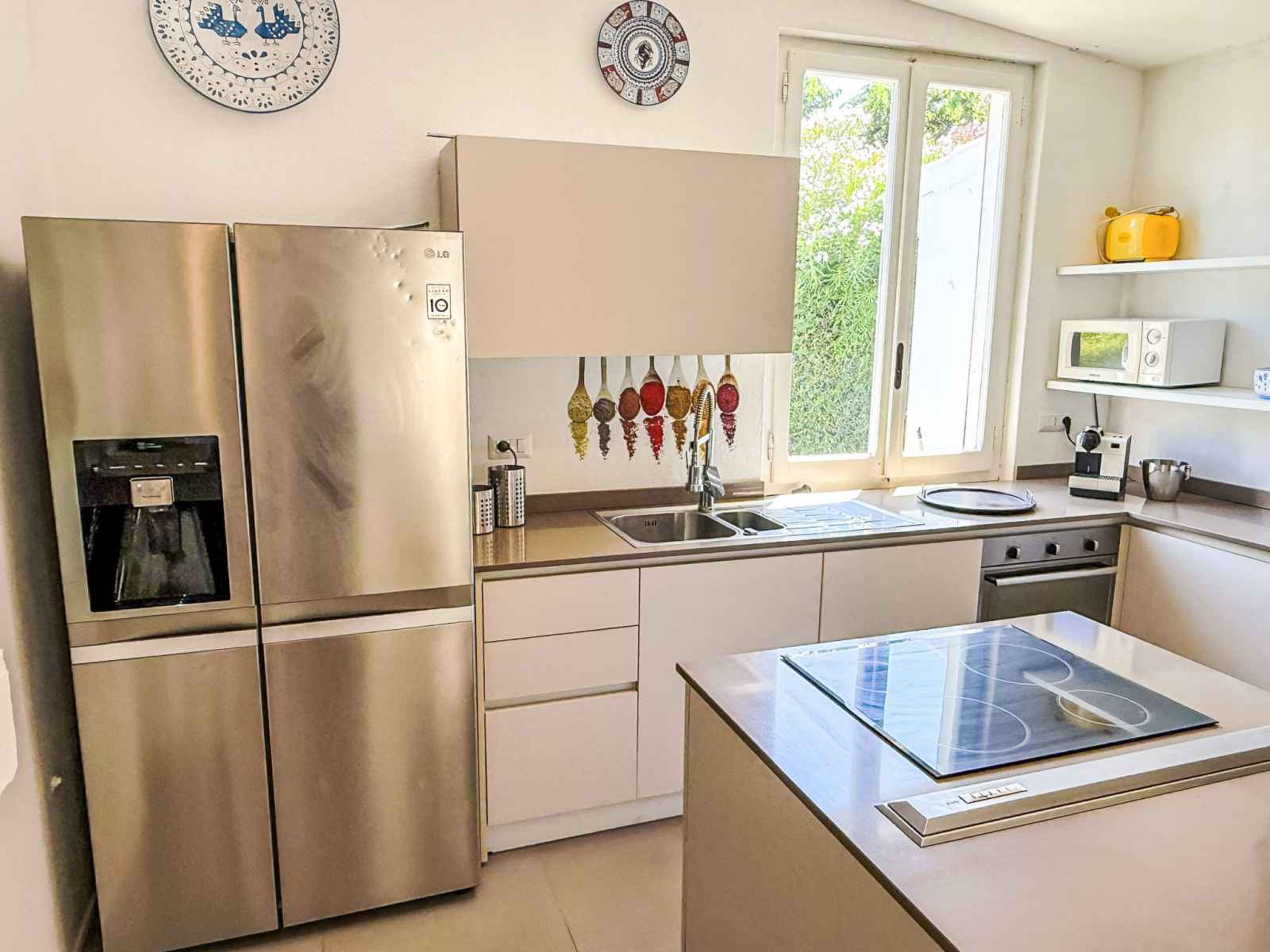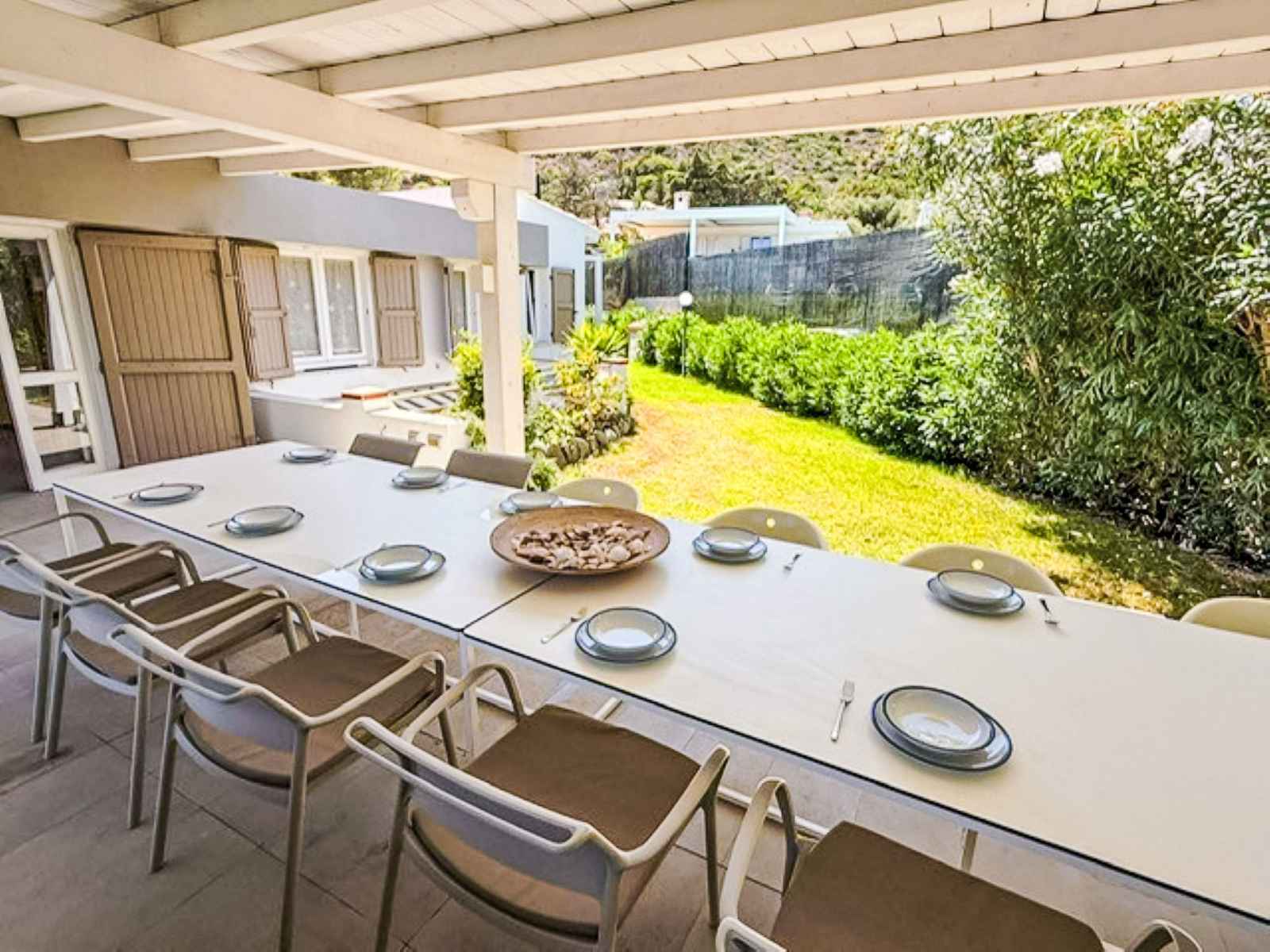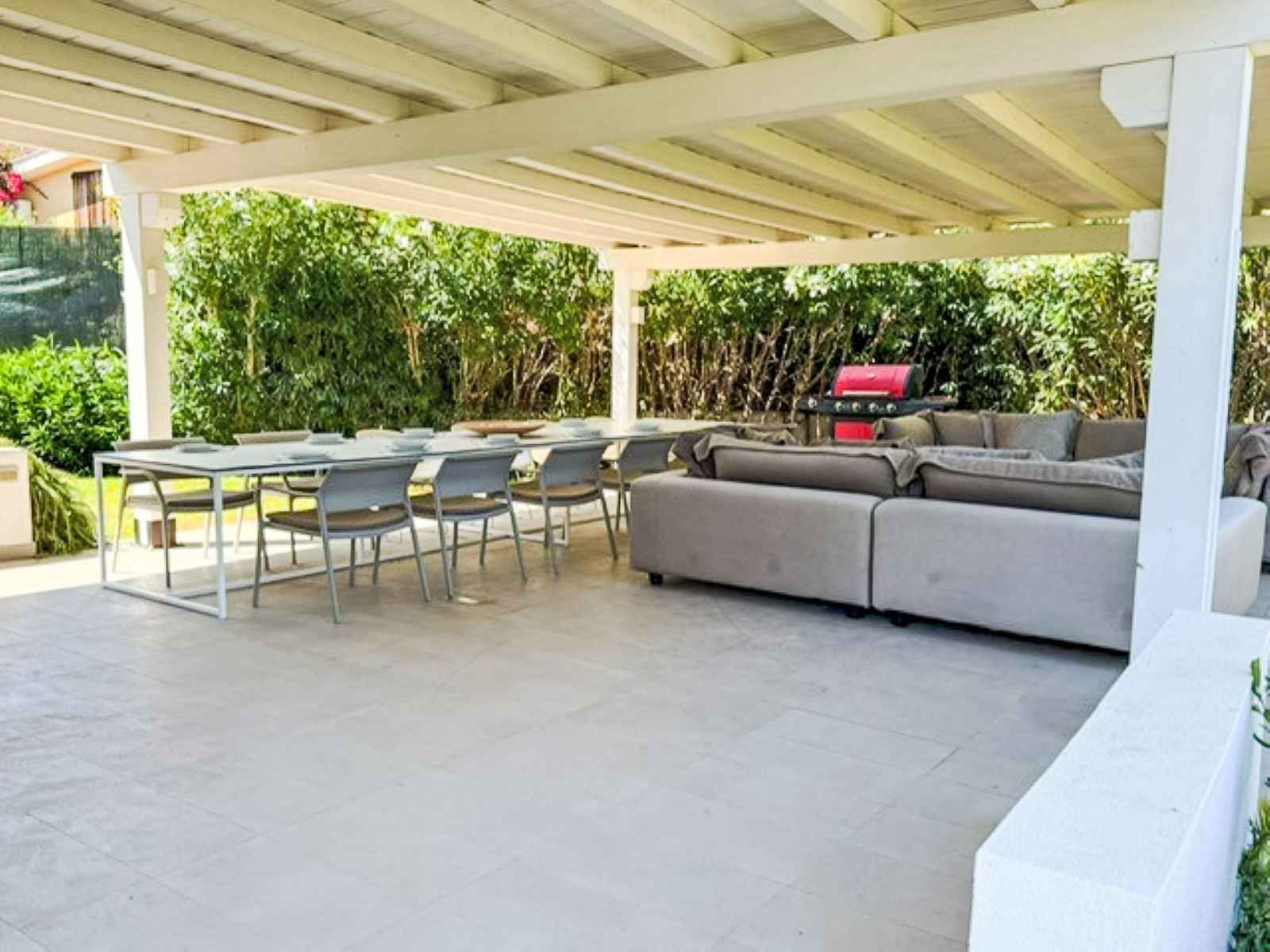 "villa mandorli", villa 6 pièces 150 m2. aménagement confortable et de bon goût: séjour/salle à manger avec tv et air-conditionné. sortie sur le jardin, sur la véranda. 1 chambre avec 1 lit et 1 lit double. 1 chambre avec 1 lit double. grande cuisine (four, 4 plaques vitrocéramiques, grille-pain, bouilloire électrique, micro-ondes,