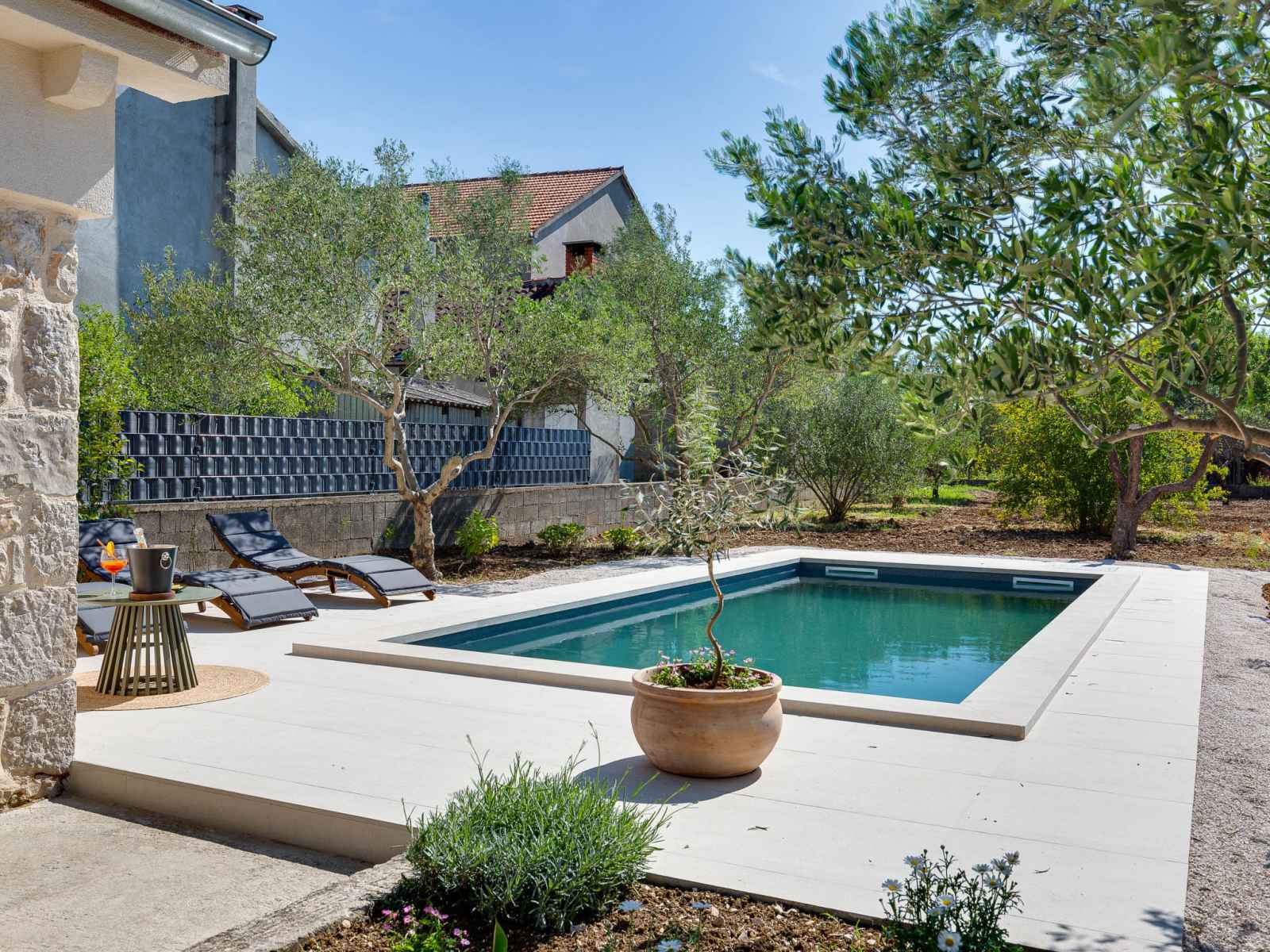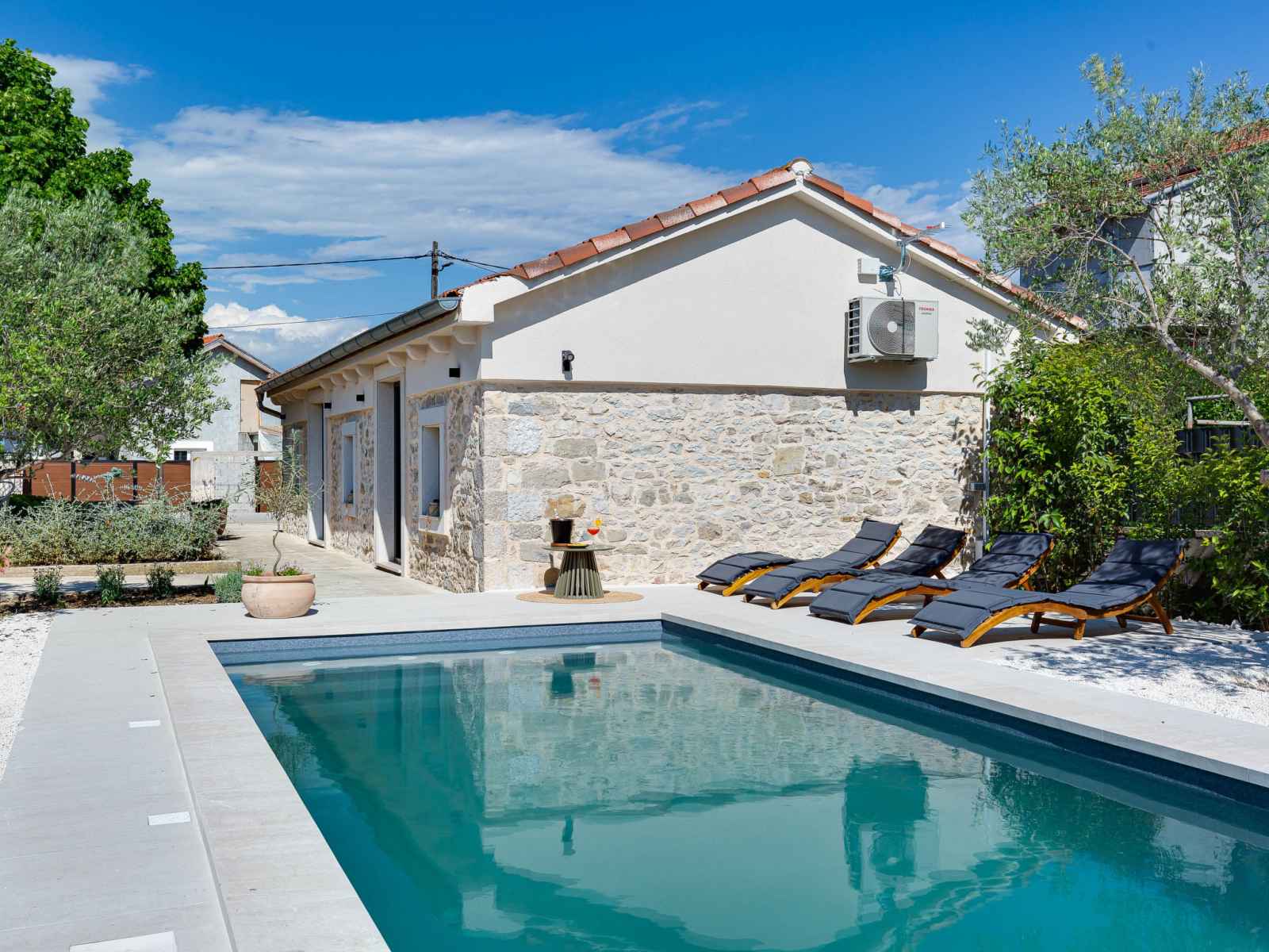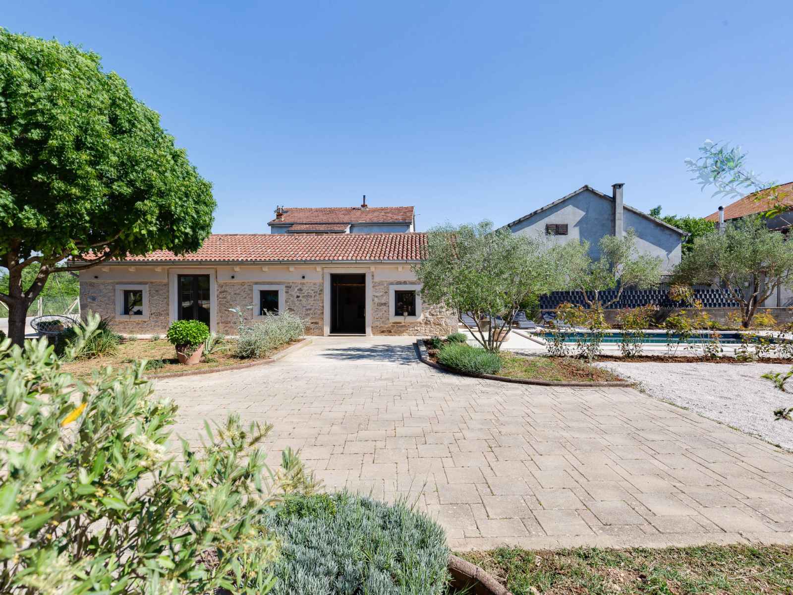 Zemunik à 10 km de zadra: belle maison individuelle "stanca", rénovée en 2024. À 800 m du centre, situation ensoleillée, surélevée, à 10 km de la mer, à 10 km de la plage. entretien de la piscine par le propriétaire/jardinier. a usage privé: terrain 200 m2 (clôturé), piscine en forme d’haricot (7 x 4 m, 28 m2, profondeur 140 cm,