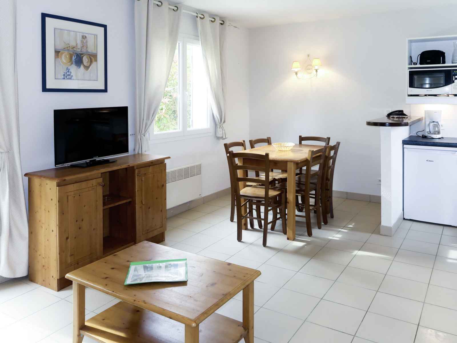 "le hameau de peemor pen m.6x", maison mitoyenne 3 pièces 43 m2 sur 2 niveaux. aménagement fonctionnel et agréable: séjour/chambre à coucher avec 1 divan-lit double (140 cm, longueur 190 cm), table pour les repas et tv. sortie sur la terrasse. cuisine ouverte (lave-vaisselle, 2 plaques vitrocéramiques, combiné micro-ondes). À l'étage