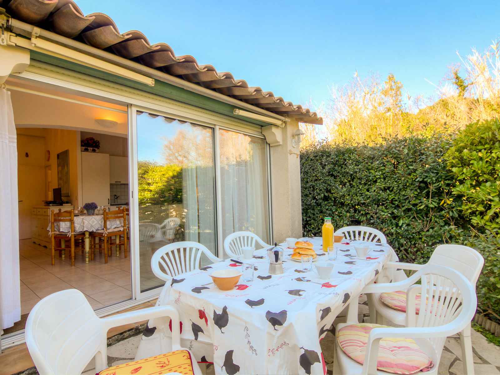 "les parcs de gassin 2", maison mitoyenne 3 pièces 45 m2. séjour/salle à manger avec tv (écran plat). sortie sur la terrasse. 1 chambre avec 1 grand-lit (140 cm, longueur 190 cm). 1 chambre avec 1 lit gigogne (2 pers. 2 x 80 cm, longueur 190 cm). cuisine (4 plaques de cuisson, mini-four, four, lave-vaisselle, micro-ondes, cafetière