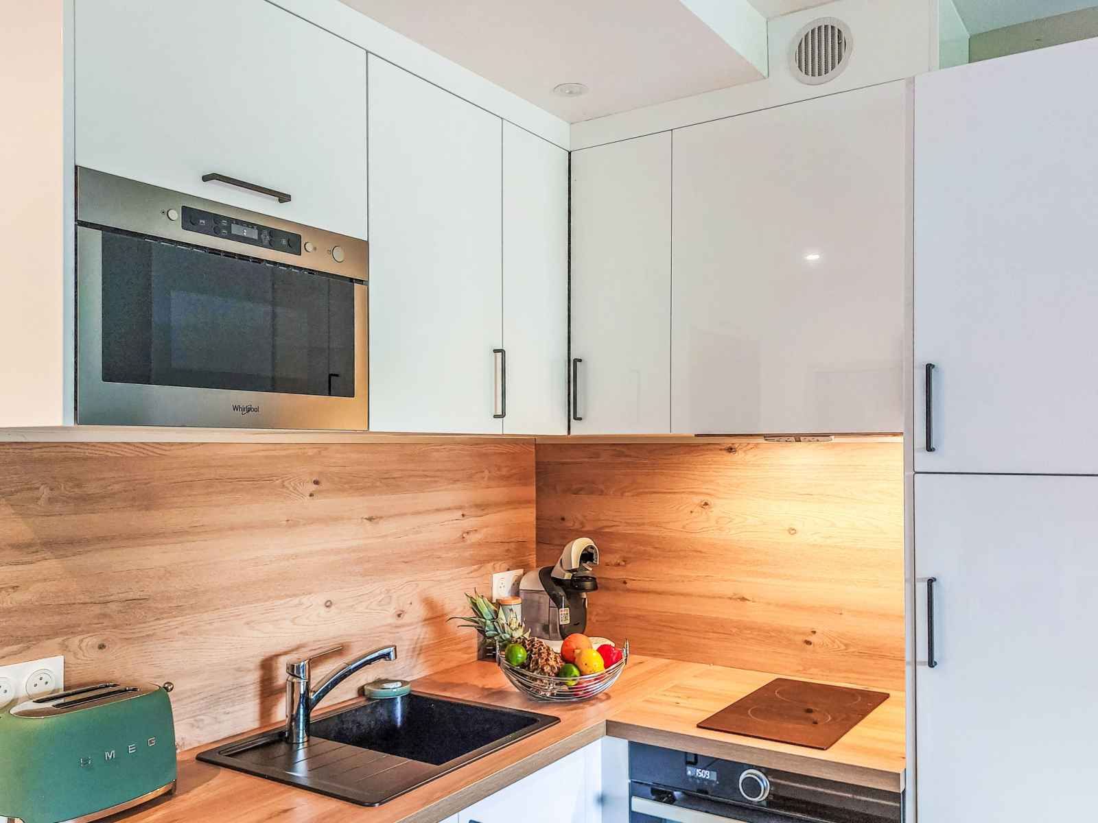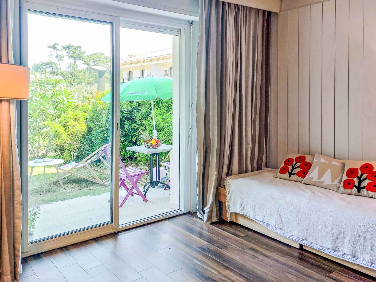 Studio 33 m2, au rez-de-chaussée, situation sud-est. partiellement en 2025, aménagement confortable et agréable: séjour/chambre à coucher avec 1 divan-lit double (140 cm, longueur 190 cm), tv (écran plat). sortie sur la terrasse, sur le jardinet, orientée sud-est. cuisine ouverte (2 plaques à induction, grille-pain, bouilloire électrique,
