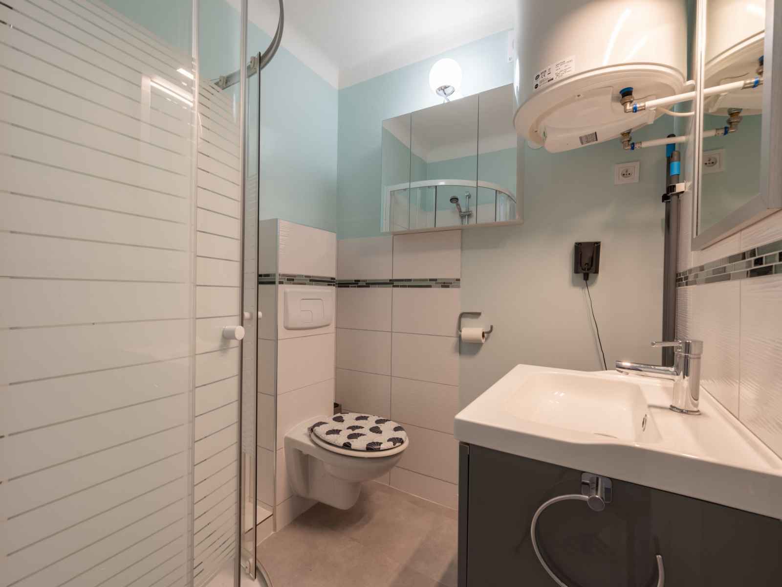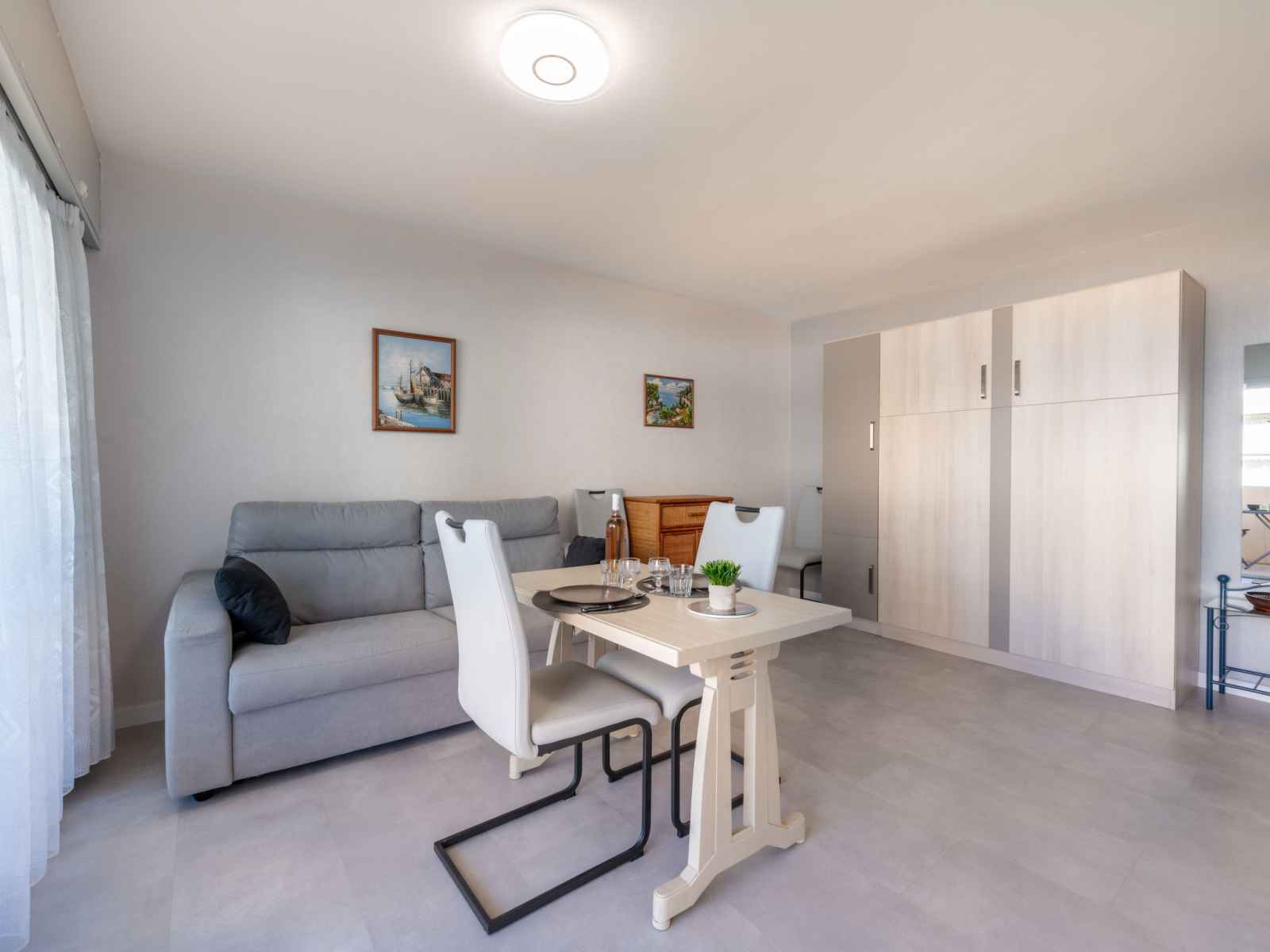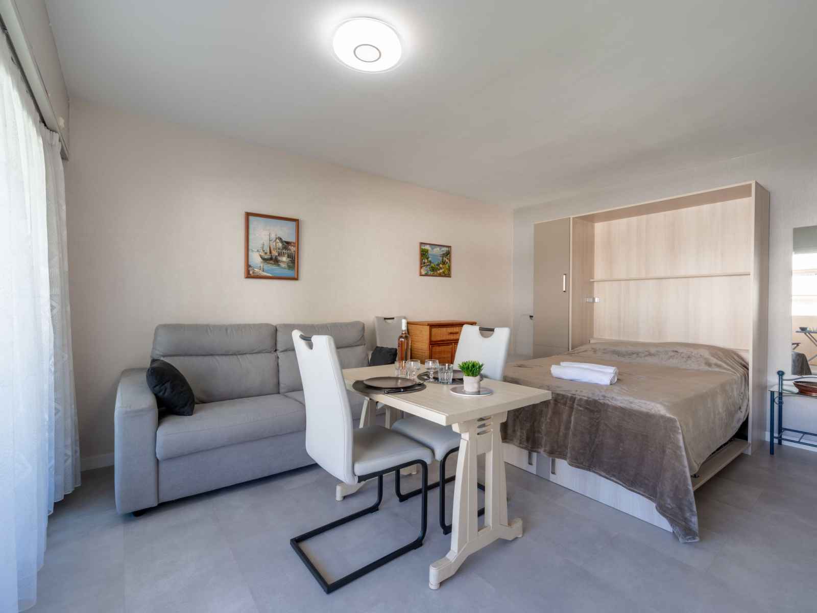 Studio 22 m2 au 2ème étage. aménagement confortable: séjour/salle à manger avec 1 grand-lit rabattable (140 cm, longueur 190 cm), tv (écran plat), air-conditionné. sortie sur la terrasse. cuisine ouverte (four, 4 plaques à induction, grille-pain, bouilloire électrique, micro-ondes, congélateur, cafetière électrique). douche/wc.