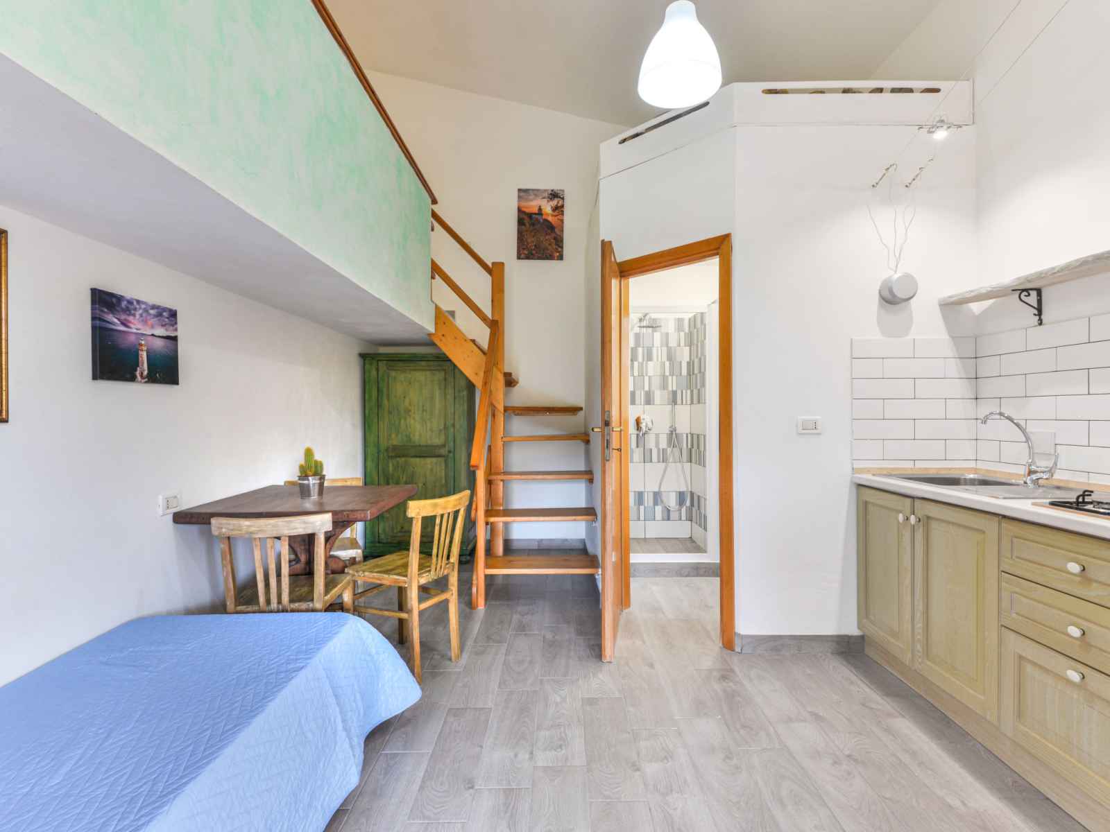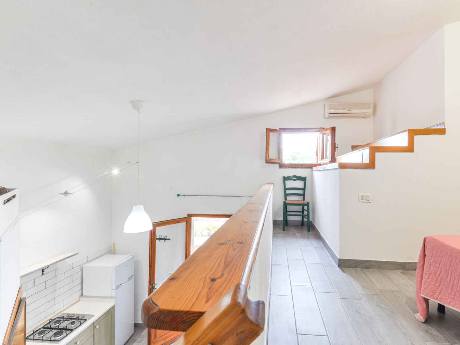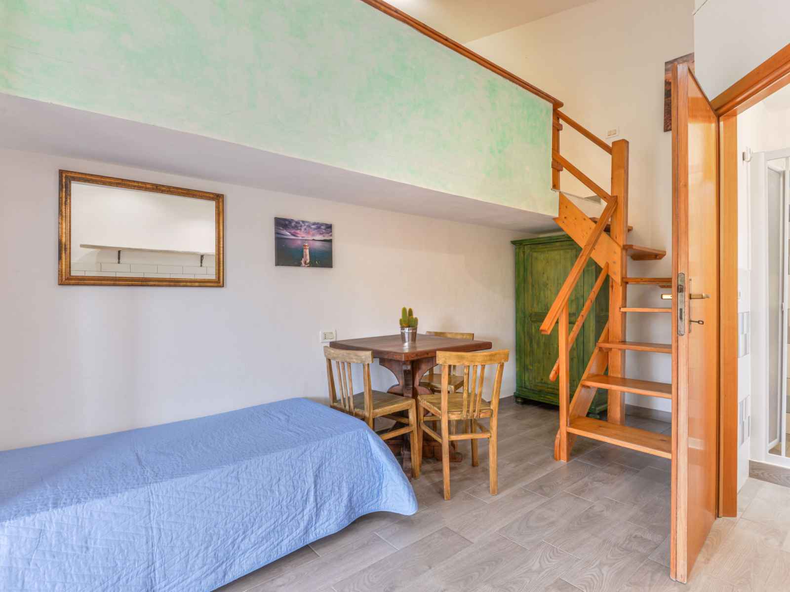 Studio 25 m2 sur 2 niveaux, au rez-de-chaussée. aménagement fonctionnel: séjour/chambre à coucher avec 1 lit (80 cm), table pour les repas. coin cuisine (4 feux). douche/bidet/wc. À l'étage supérieur: galerie mansardée, ouverte avec 1 lit double et air-conditionné. chauffage, air-conditionné. terrasse 18 m2, couverte. meubles de