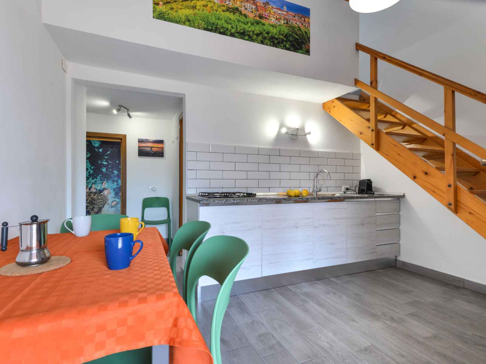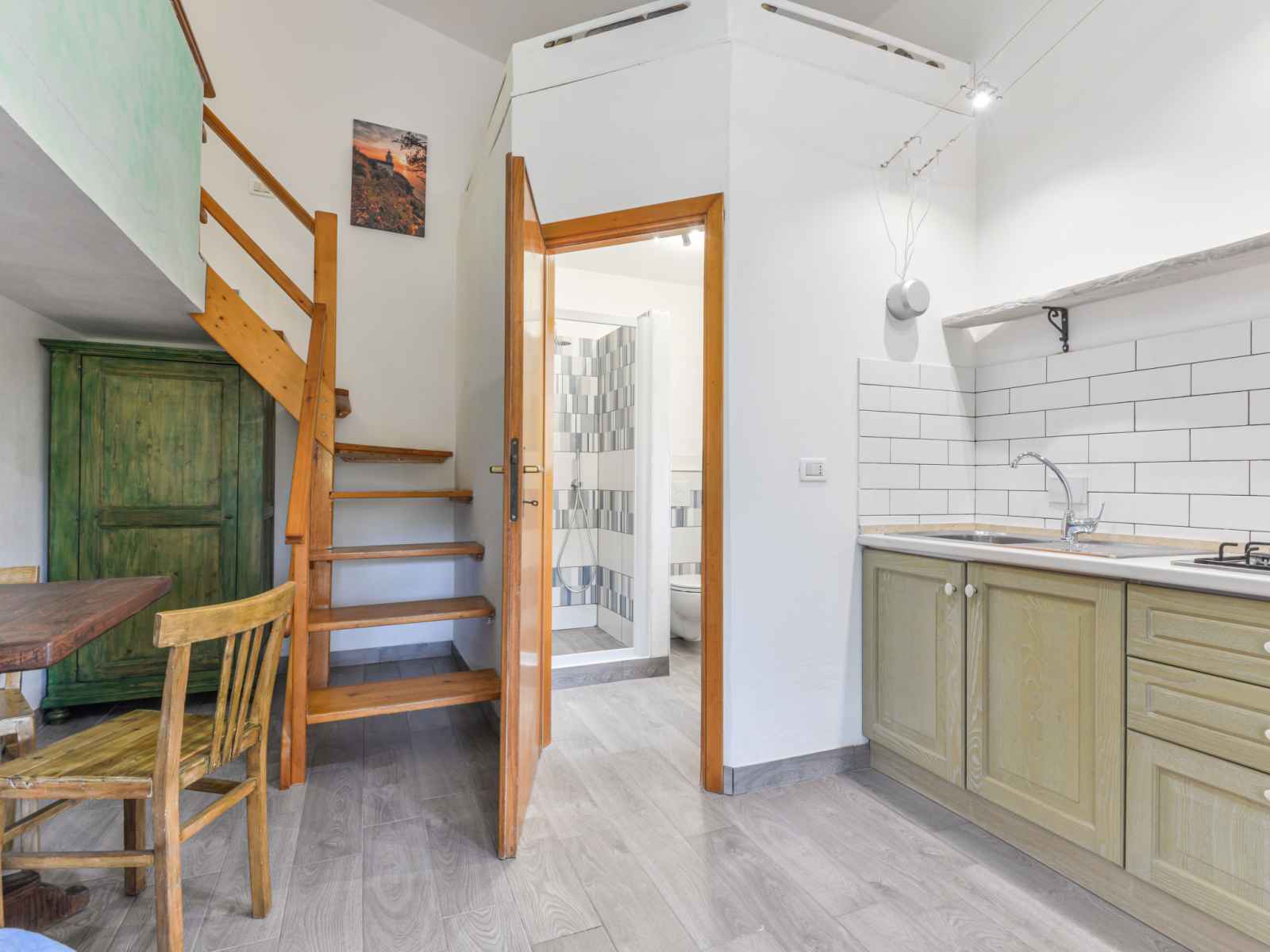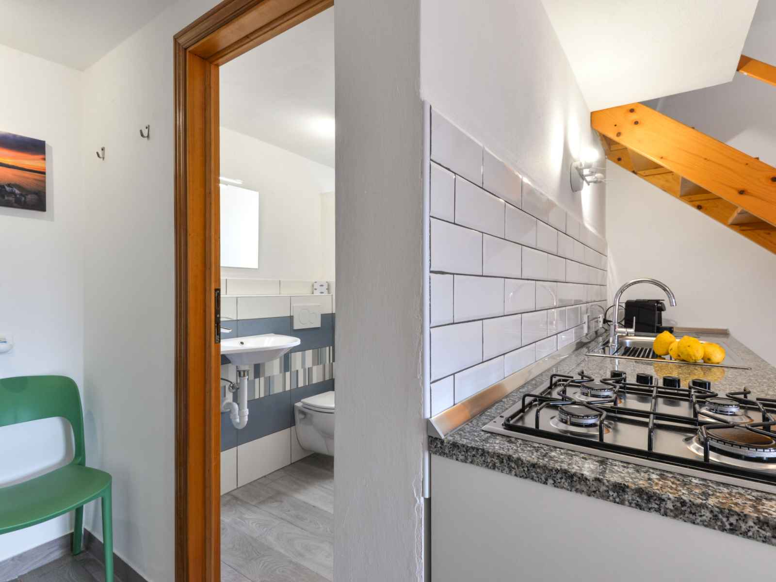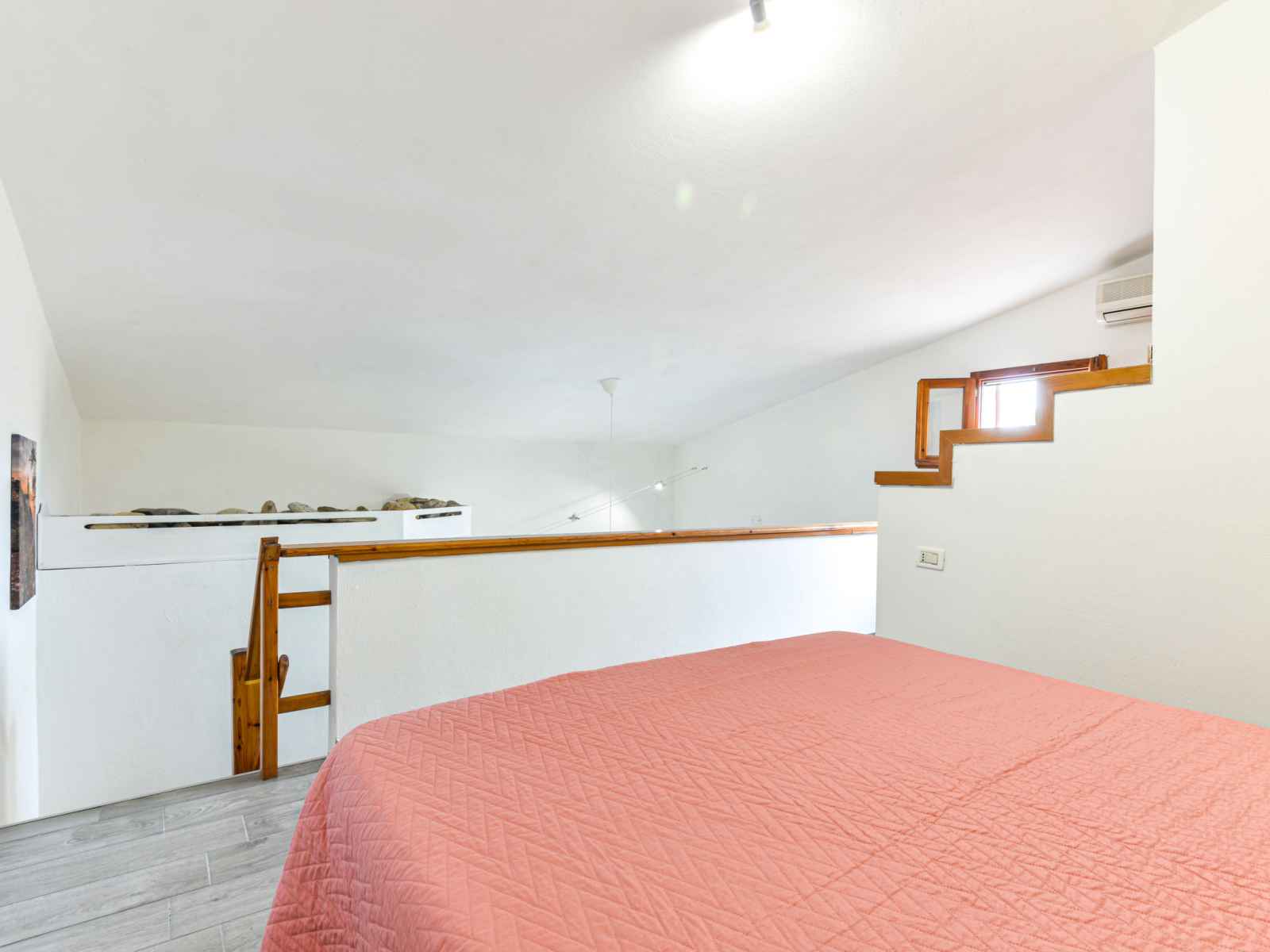 Studio 25 m2 sur 2 niveaux, au rez-de-chaussée. aménagement fonctionnel: séjour/chambre à coucher avec 1 lit (80 cm), table pour les repas. coin cuisine (4 feux). douche/bidet/wc. À l'étage supérieur: galerie mansardée, ouverte avec 1 lit double et air-conditionné. chauffage, air-conditionné. terrasse 18 m2, couverte. meubles de