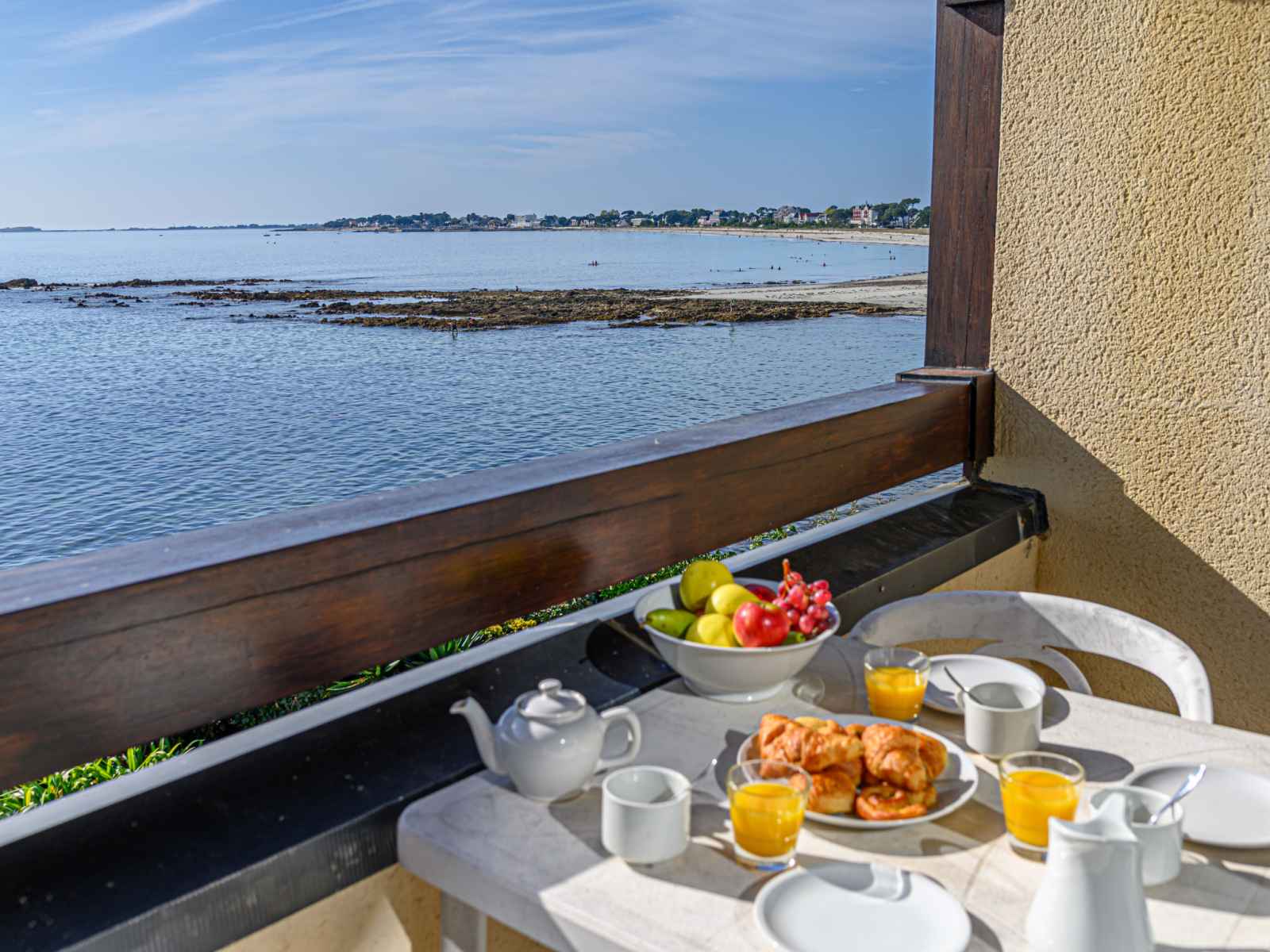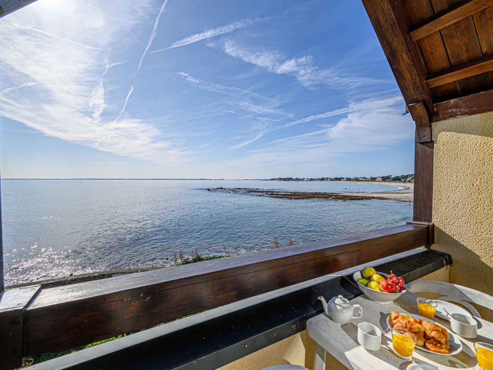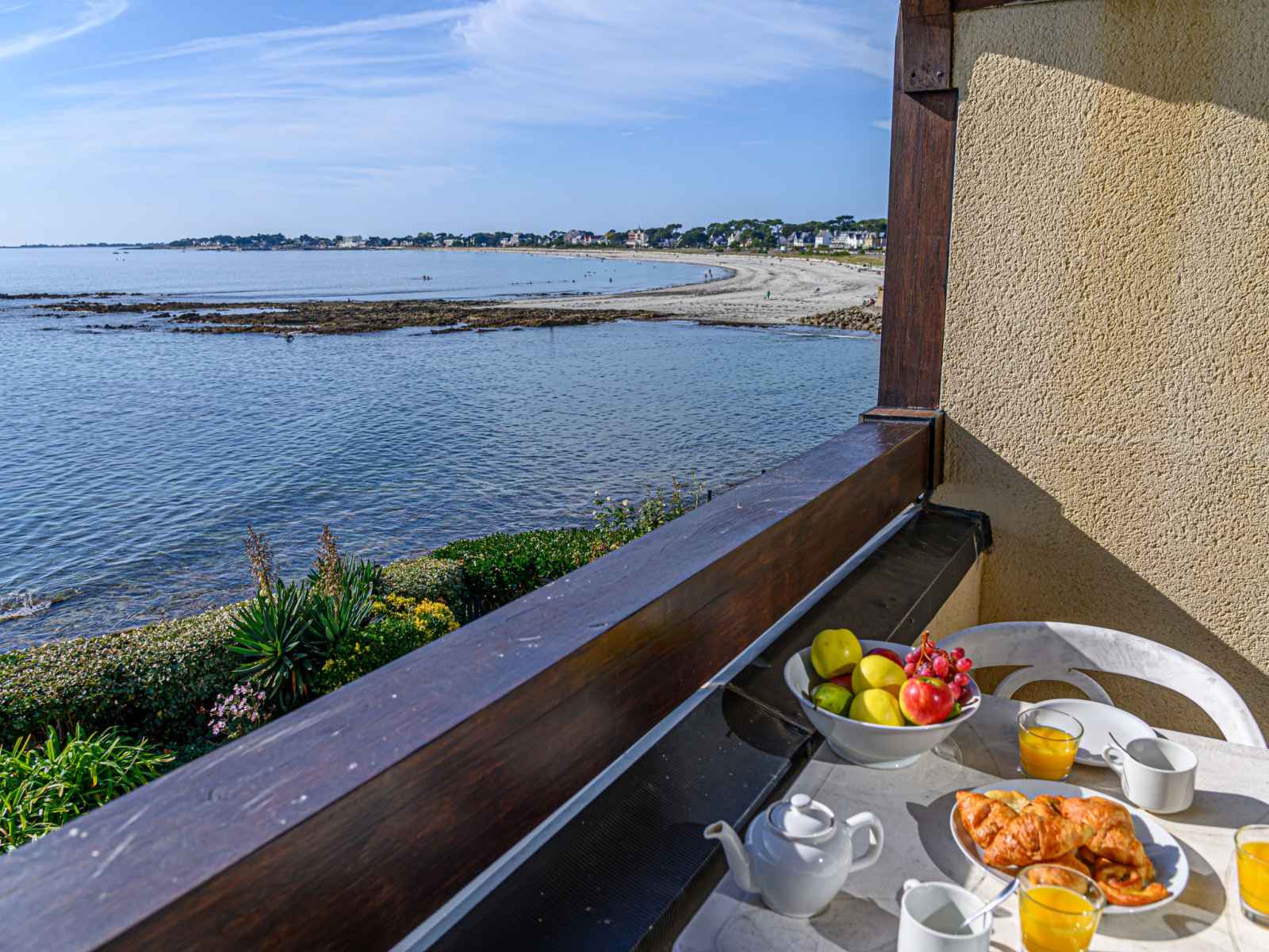 Petite résidence "plein océan", de 2 étages. dans la localité, à 1.5 km du centre de carnac plage, situation tranquille, ensoleillée dans un quartier résidentiel, à 10 m de la mer, à 50 m de la plage, accès direct à la plage. place de parking (nombre de places limité), parking public possible dans la rue. supermarché 1 km, restaurant