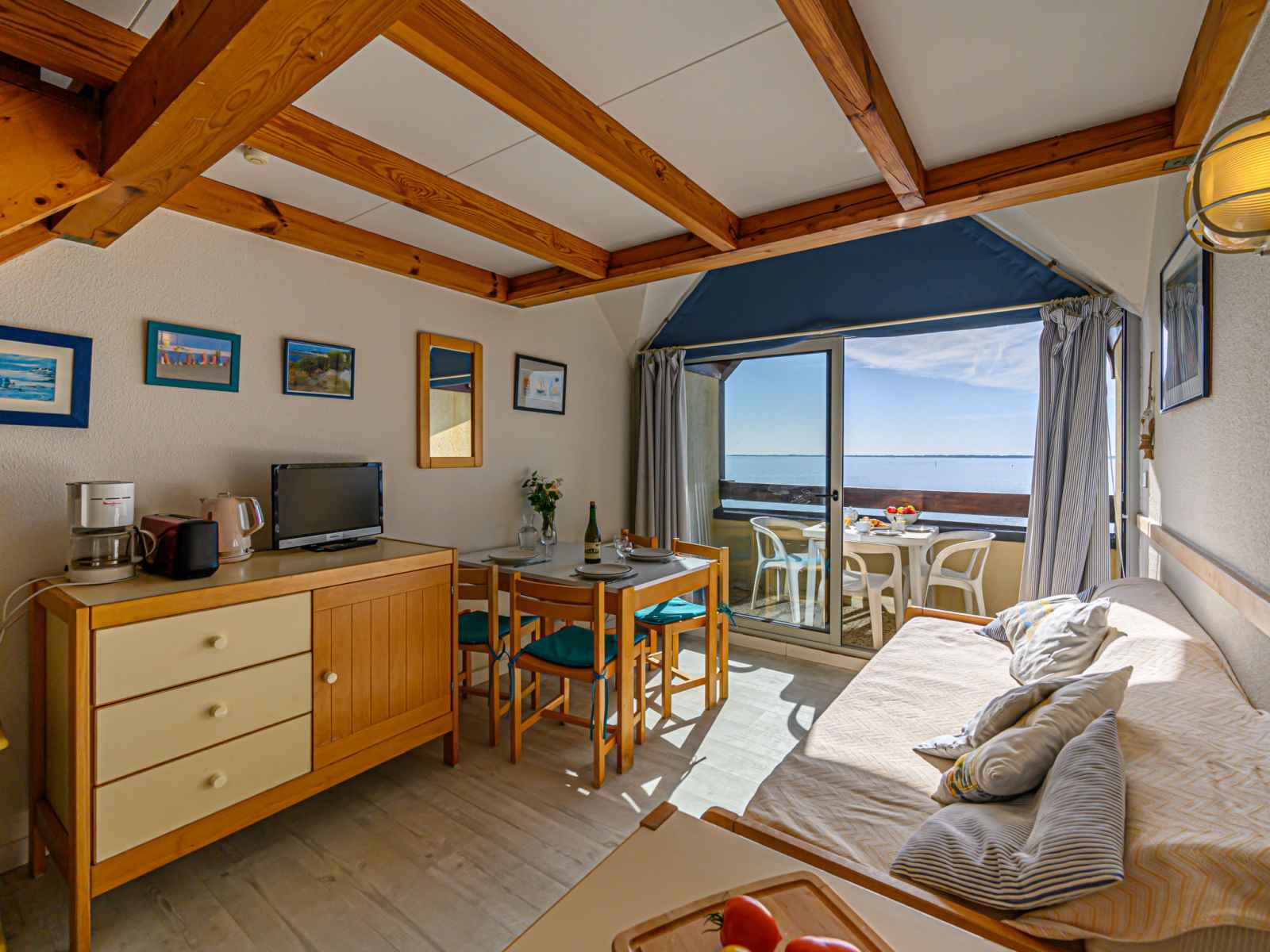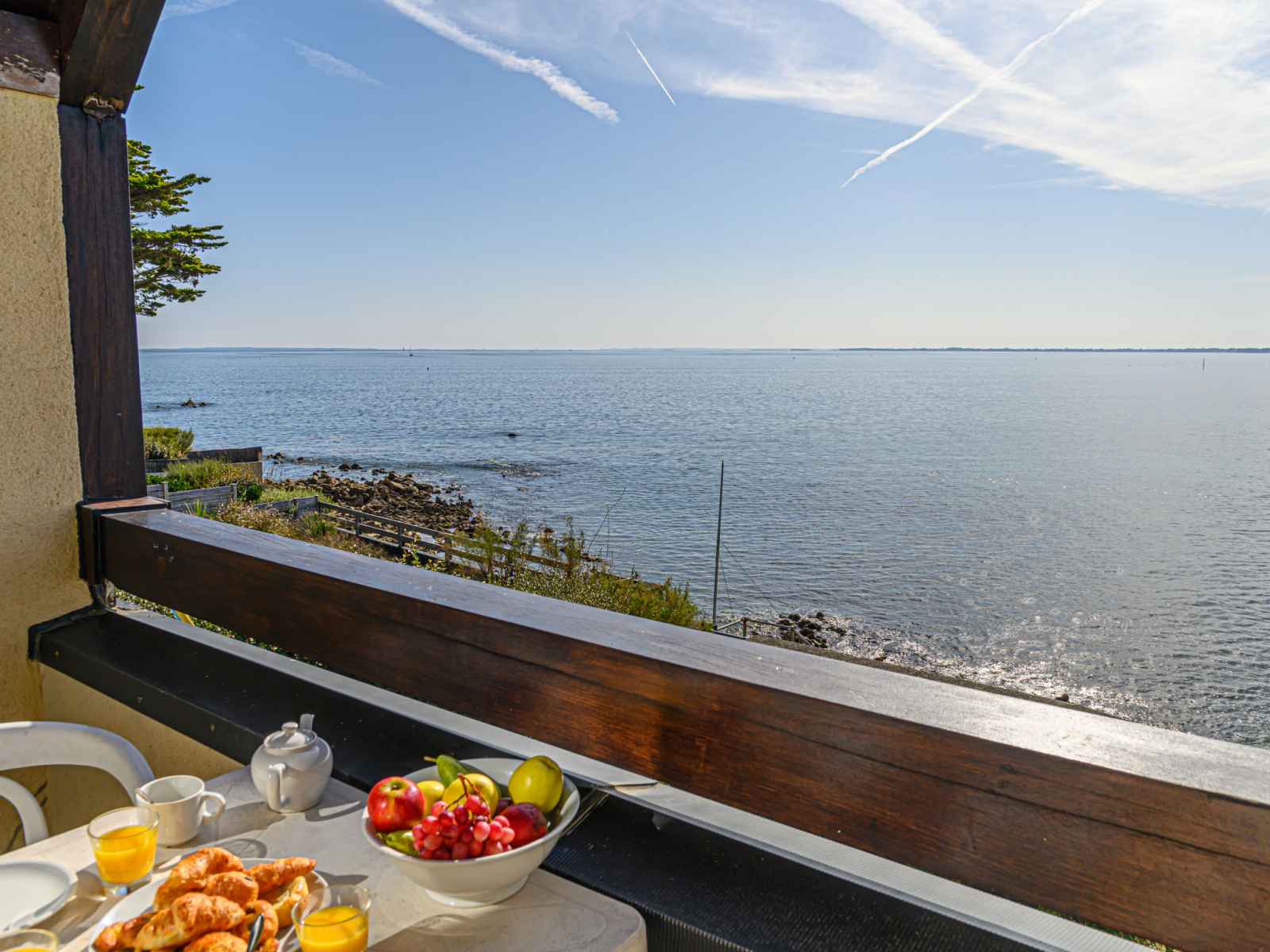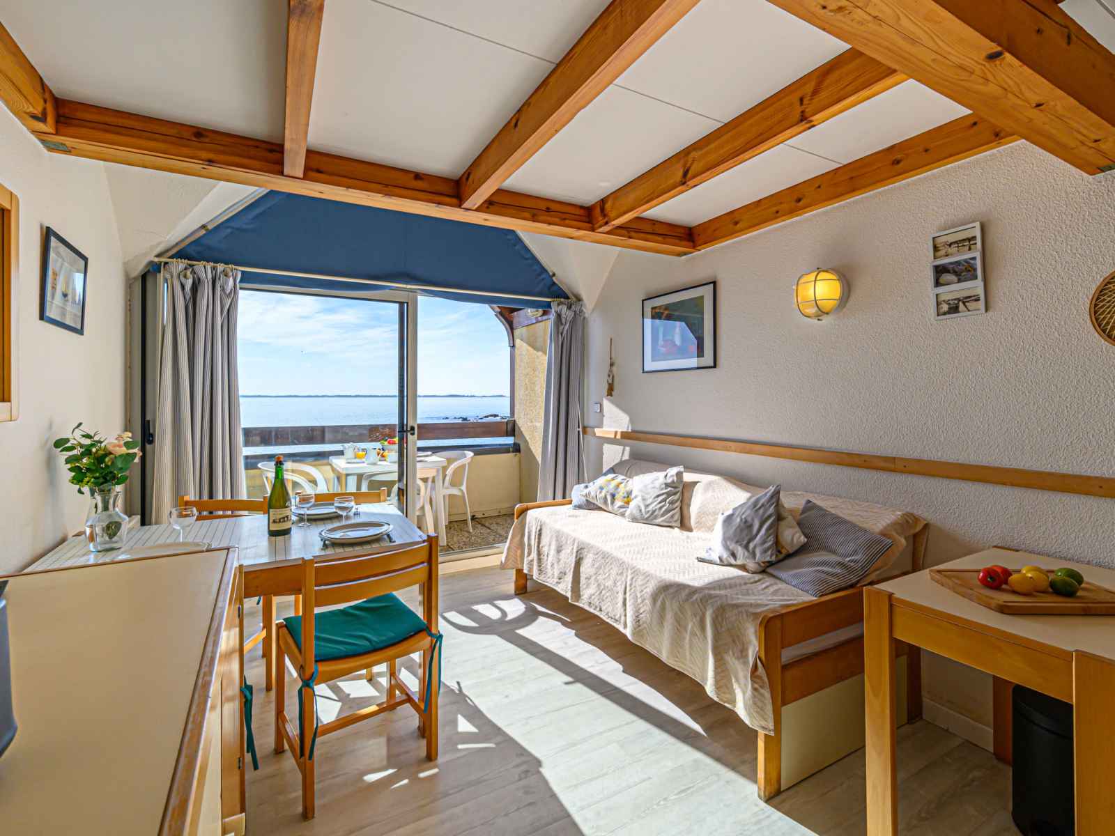 Petite résidence "plein océan", de 2 étages. dans la localité, à 1.5 km du centre de carnac plage, situation tranquille, ensoleillée dans un quartier résidentiel, à 10 m de la mer, à 50 m de la plage, accès direct à la plage. place de parking (nombre de places limité), parking public possible dans la rue. supermarché 1 km, restaurant