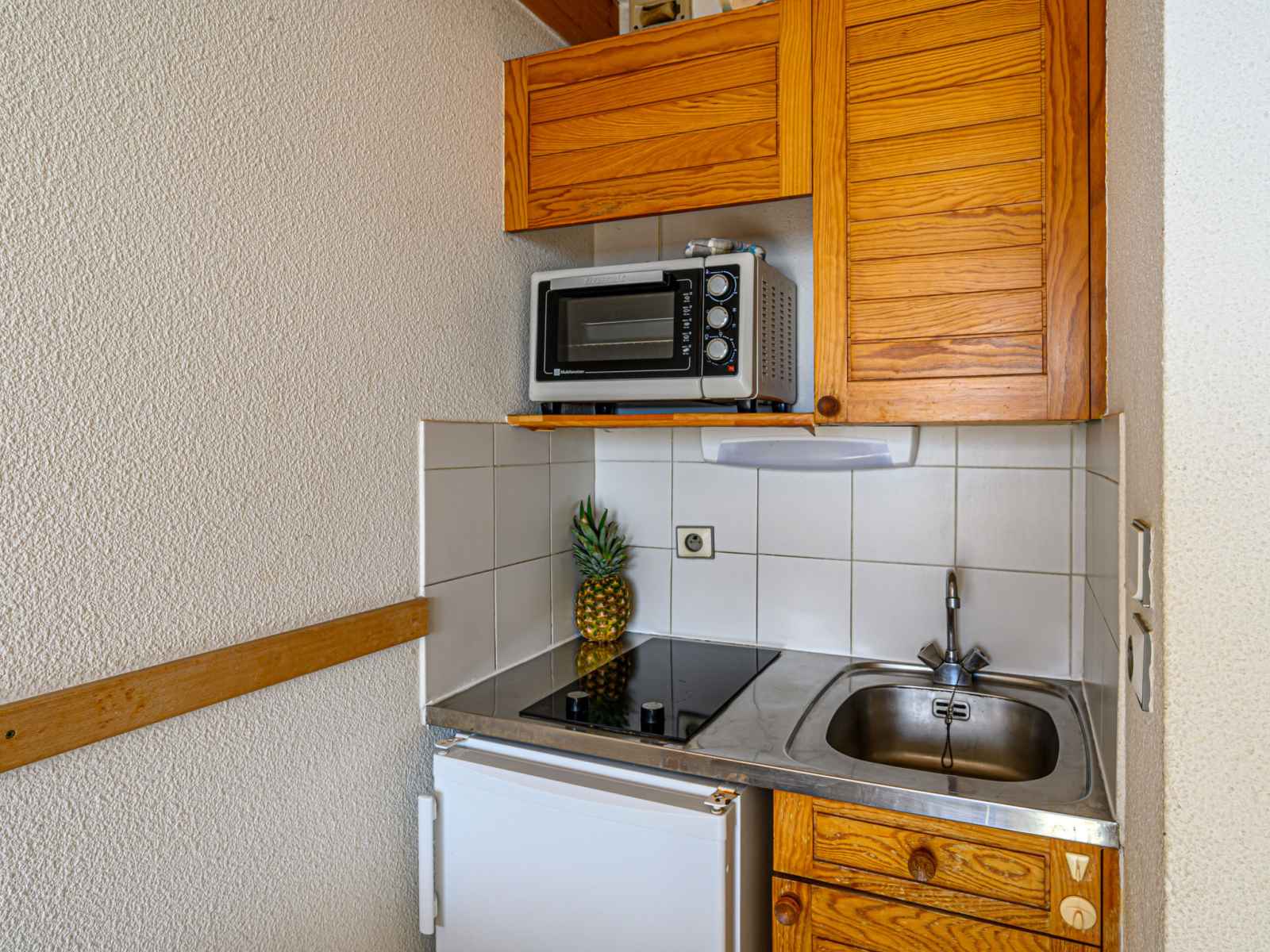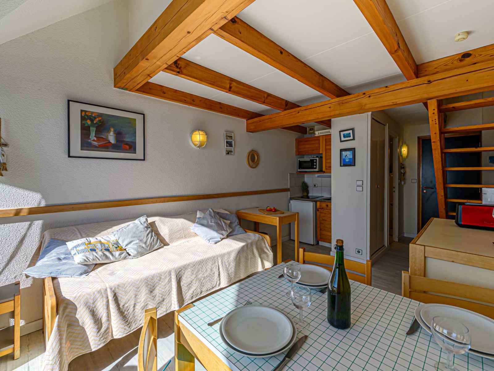 Apt 2 pièces 32 m2 sur 2 niveaux au 1er étage. séjour/salle à manger avec 1 lit (80 cm, longueur 190 cm), tv (écran plat). coin cuisine (mini-four, 2 plaques vitrocéramiques, grille-pain, bouilloire électrique, micro-ondes, cafetière électrique). douche/wc. chauffage électrique. À l'étage supérieur: 1 petite chambre avec 2 lits (90