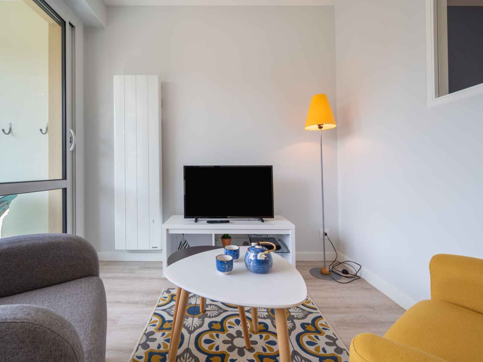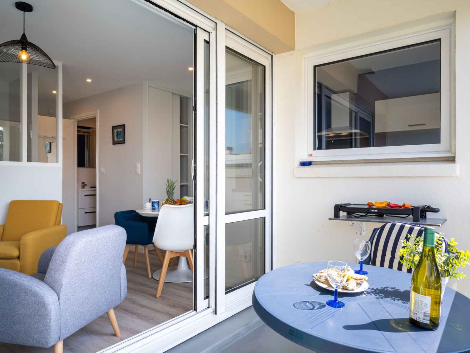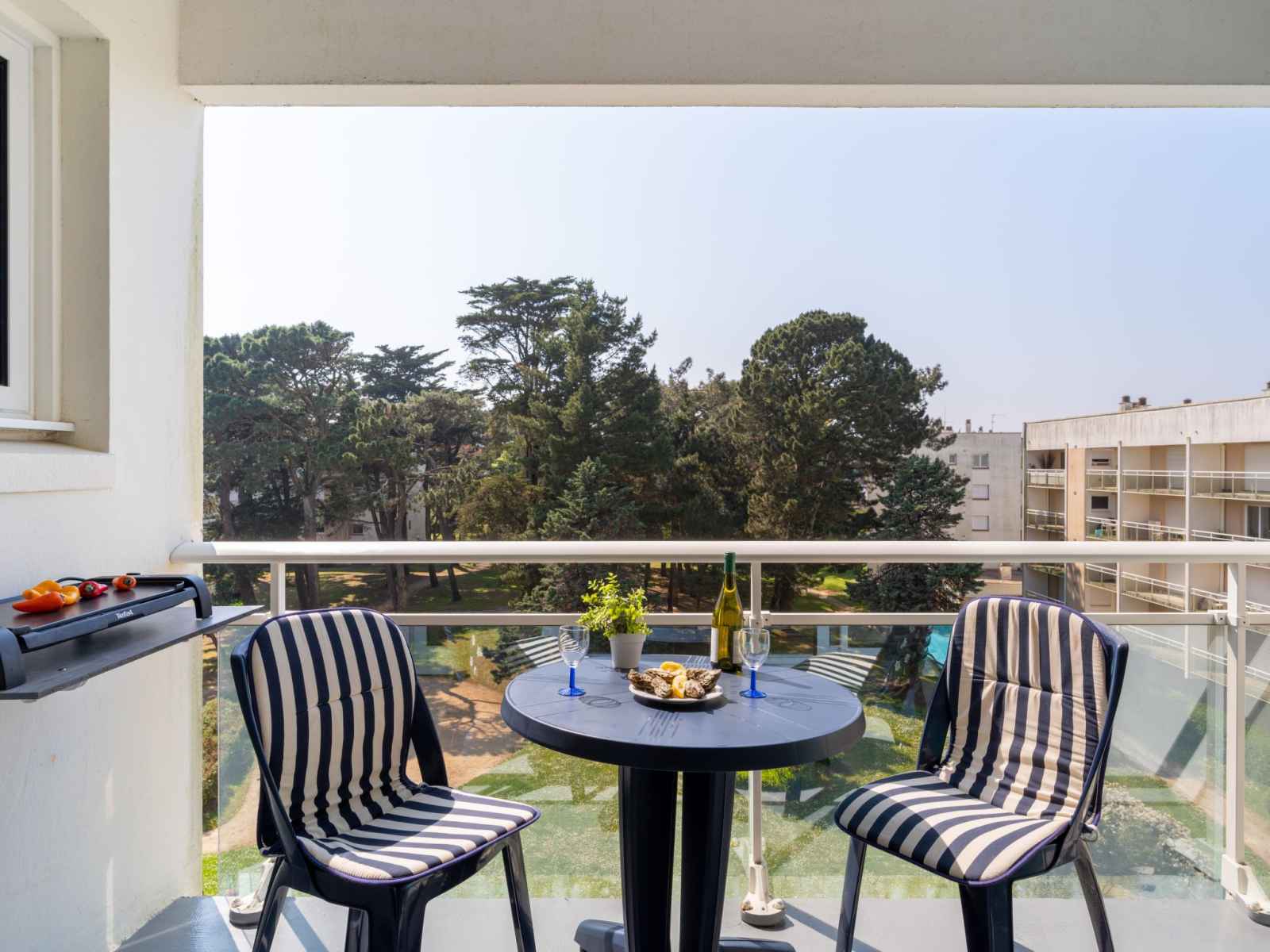 Chauffage électrique. Balcon 5 m2. Mobilier de balcon. A disposition: Internet (Connexion WIFI, gratuit). 2 lits simples peuvent être réunis. Plancha. Petit aperçu de la mer depuis le balcon.