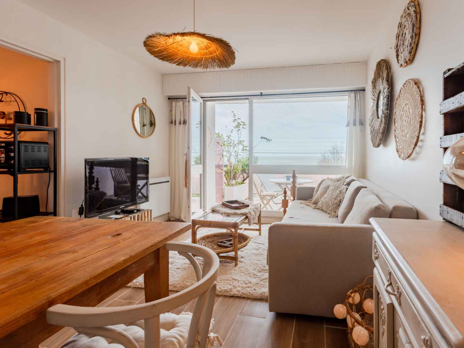 "les flots bleus" studio 29 m2, au rez-de-chaussée, situation nord-ouest. rénové en 2023: séjour/salle à manger avec 1 divan-lit double (140 cm, longueur 200 cm), tv (écran plat). sortie sur la terrasse. 1 petite chambre ouverte avec 1 lit double (1 x 140 cm, longueur 200 cm). coin cuisine (2 plaques vitrocéramiques, cafetière