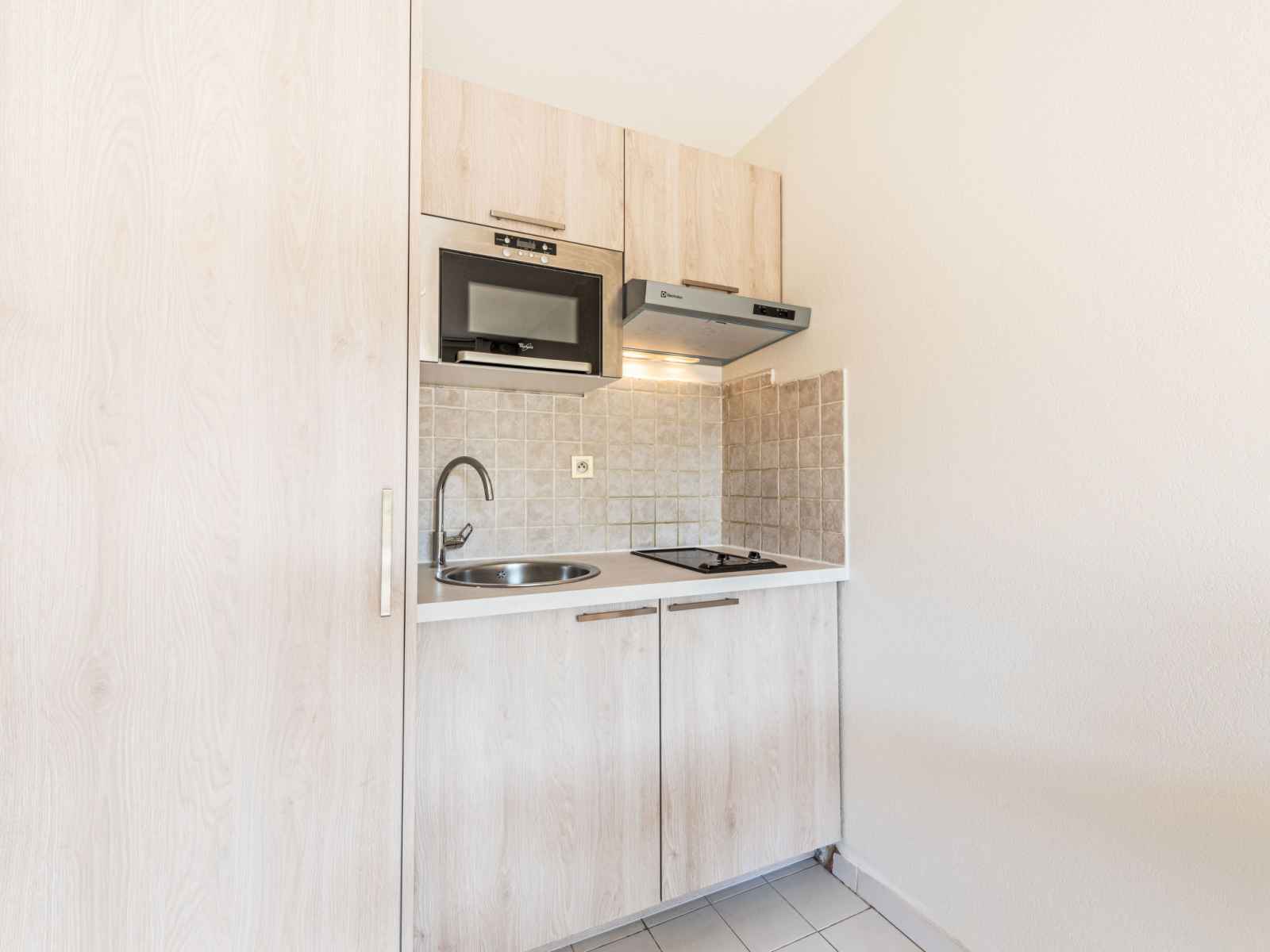 "caesar domus 2" studio 25 m2 au 2ème étage. rénové en 2021, aménagement agréable: entrée avec 1 lit (80 cm, longueur 190 cm). séjour/salle à manger avec 1 divan-lit double (140 cm, longueur 190 cm), tv (écran plat). sortie sur le balcon. coin cuisine (2 plaques vitrocéramiques, grille-pain, bouilloire électrique, micro-ondes,