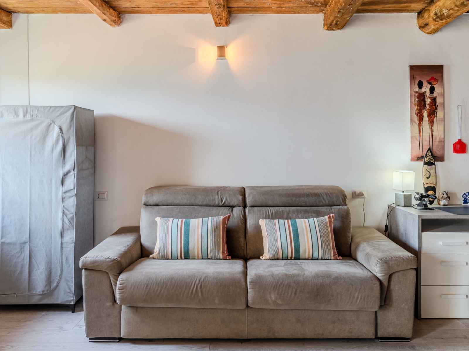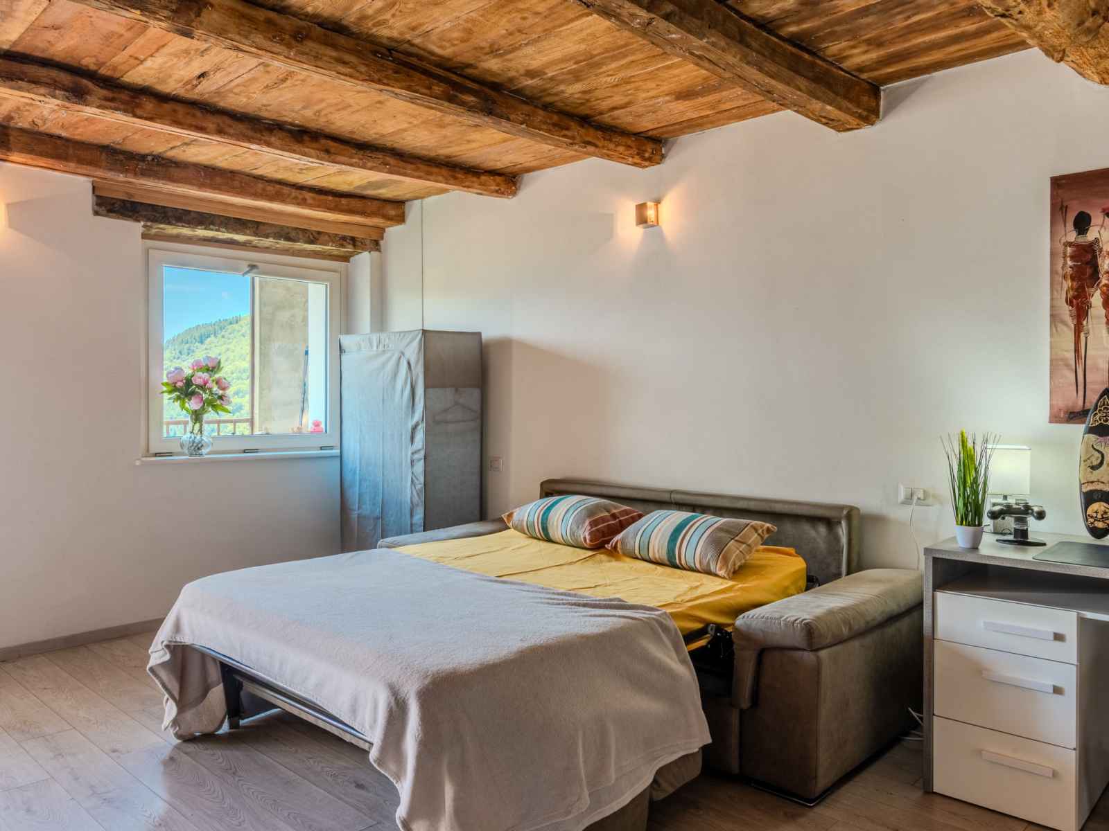Studio loft 50 m2 au 1er étage. rénové, aménagement confortable et agréable: séjour/chambre à coucher ouvert avec 1 divan-lit double (160 cm, longueur 190 cm), table pour les repas et tv (écran plat), radiateur. sortie sur le balcon. cuisine ouverte (four, 4 plaques à induction, grille-pain, bouilloire électrique, micro-ondes,