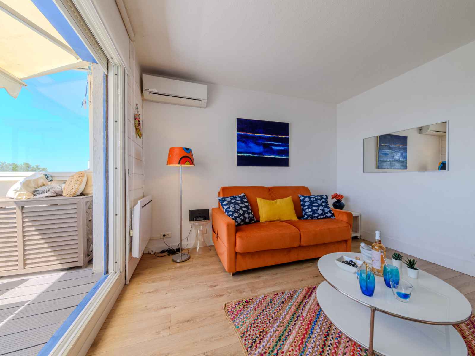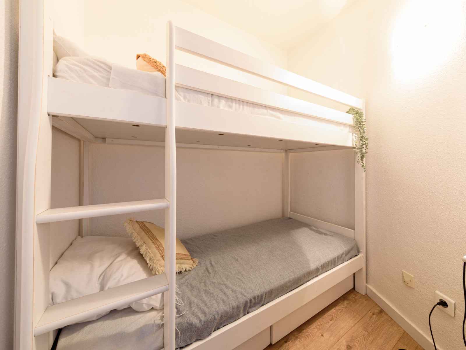 Studio 26 m2 au 4ème étage, situation sud. logement idéal pour 2 adultes + 2 enfants. séjour/salle à manger avec 1 divan-lit double (140 cm, longueur 190 cm), tv (écran plat), radiateur électrique, air-conditionné et volet roulant électrique. cabine avec 1 x 2 lits superposés (80 cm, longueur 190 cm). coin cuisine (2 plaques à