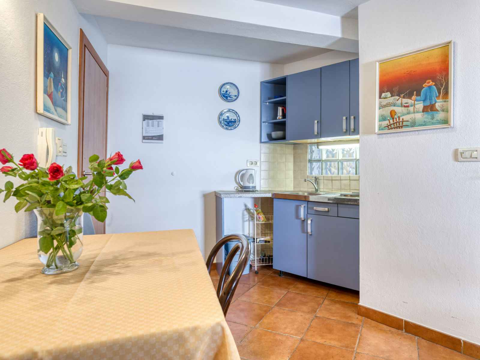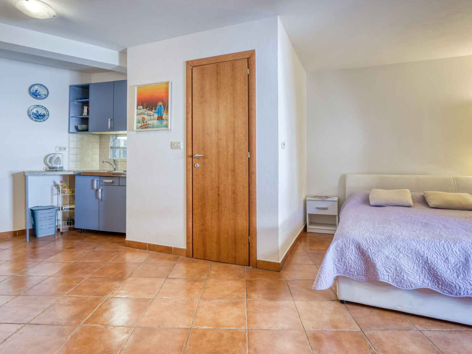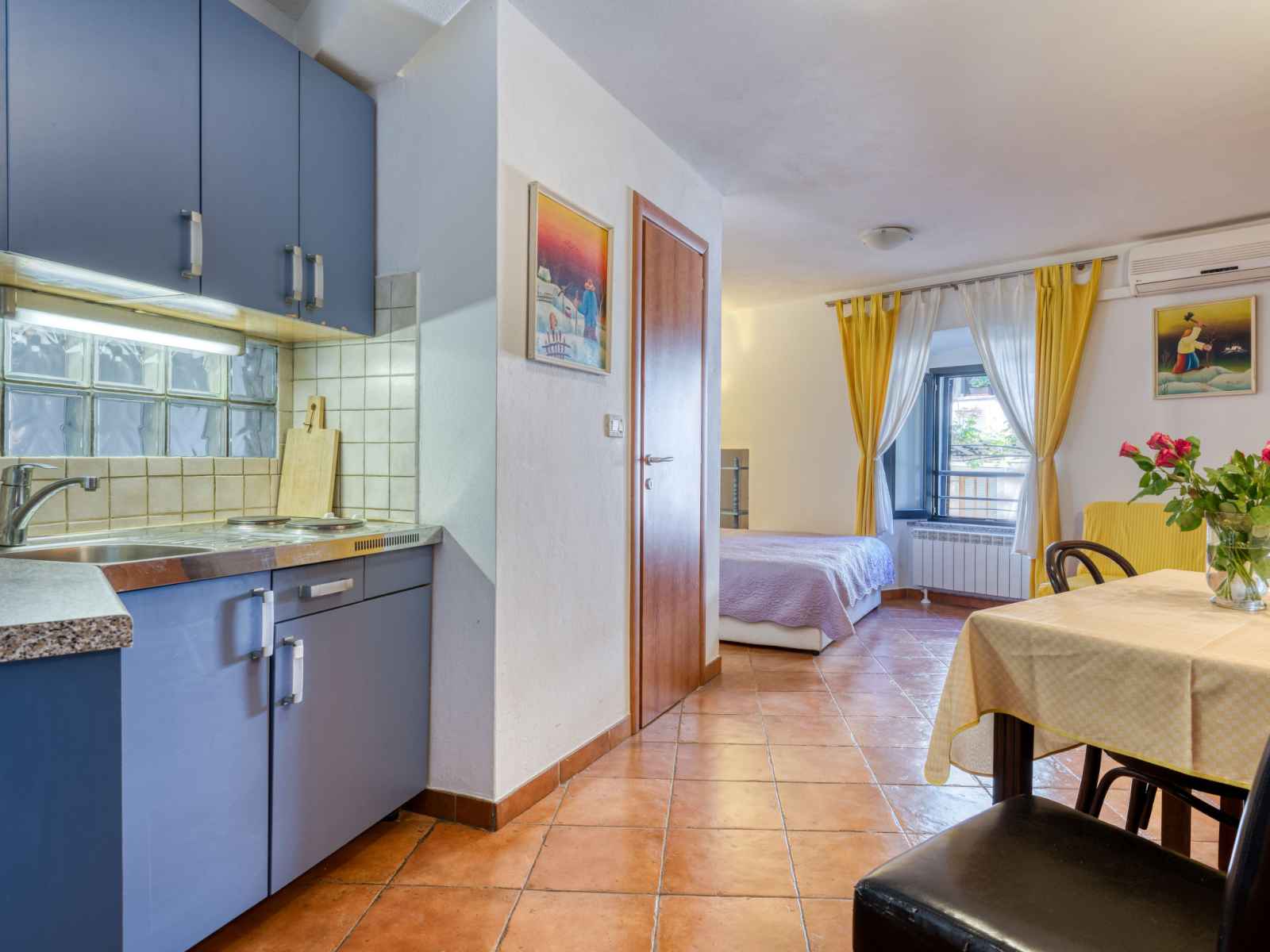 Studio 27 m2, au rez-de-chaussée. studio avec 1 divan-lit (100 cm, longueur 190 cm), 1 grand-lit (160 cm, longueur 200 cm), table pour les repas, tv (satellite) et air-conditionné. cuisine ouverte (2 plaques de cuisson, cafetière électrique). douche/wc. chauffage à air chaud. a disposition: internet (connexion wifi, gratuit).