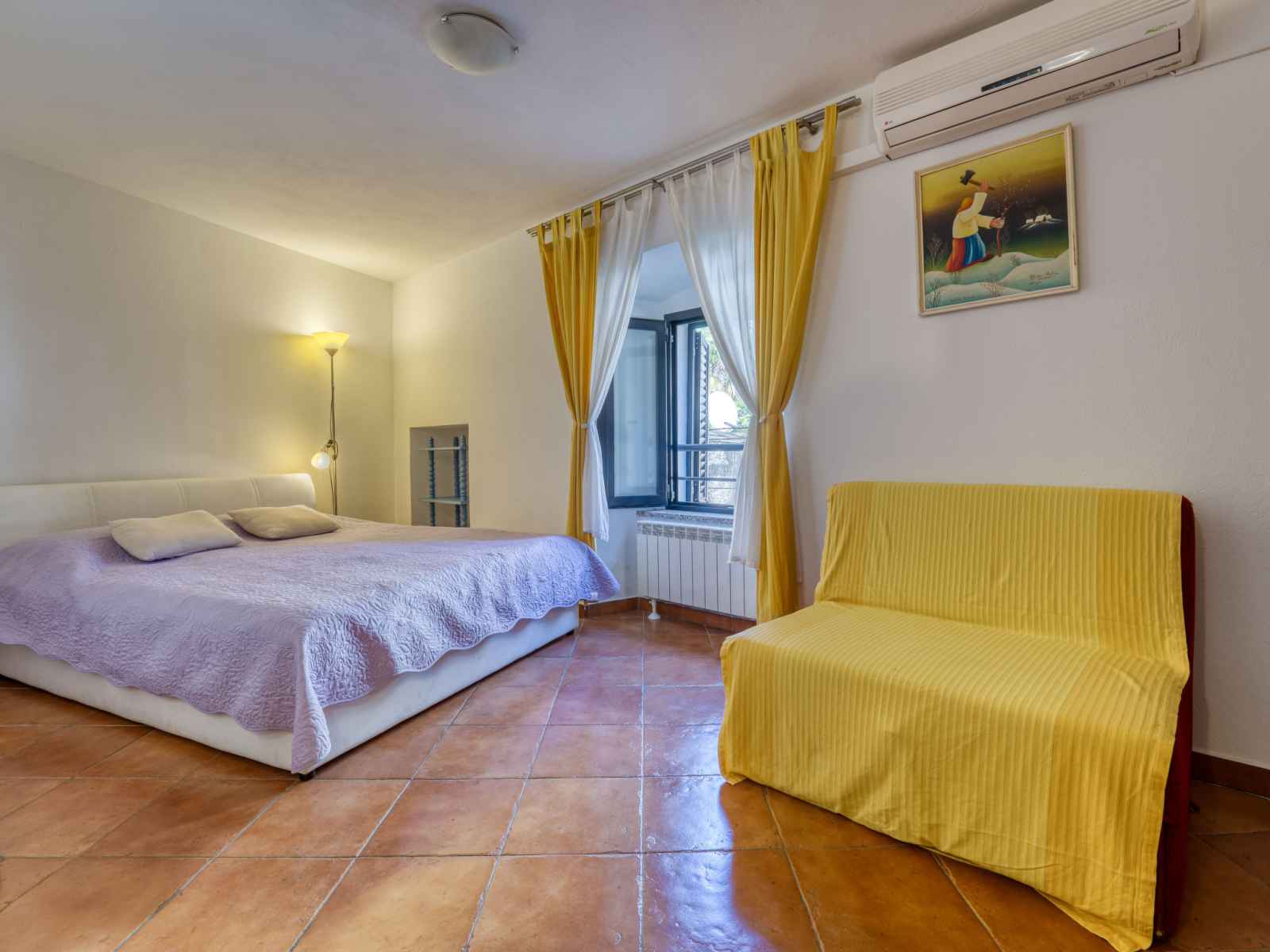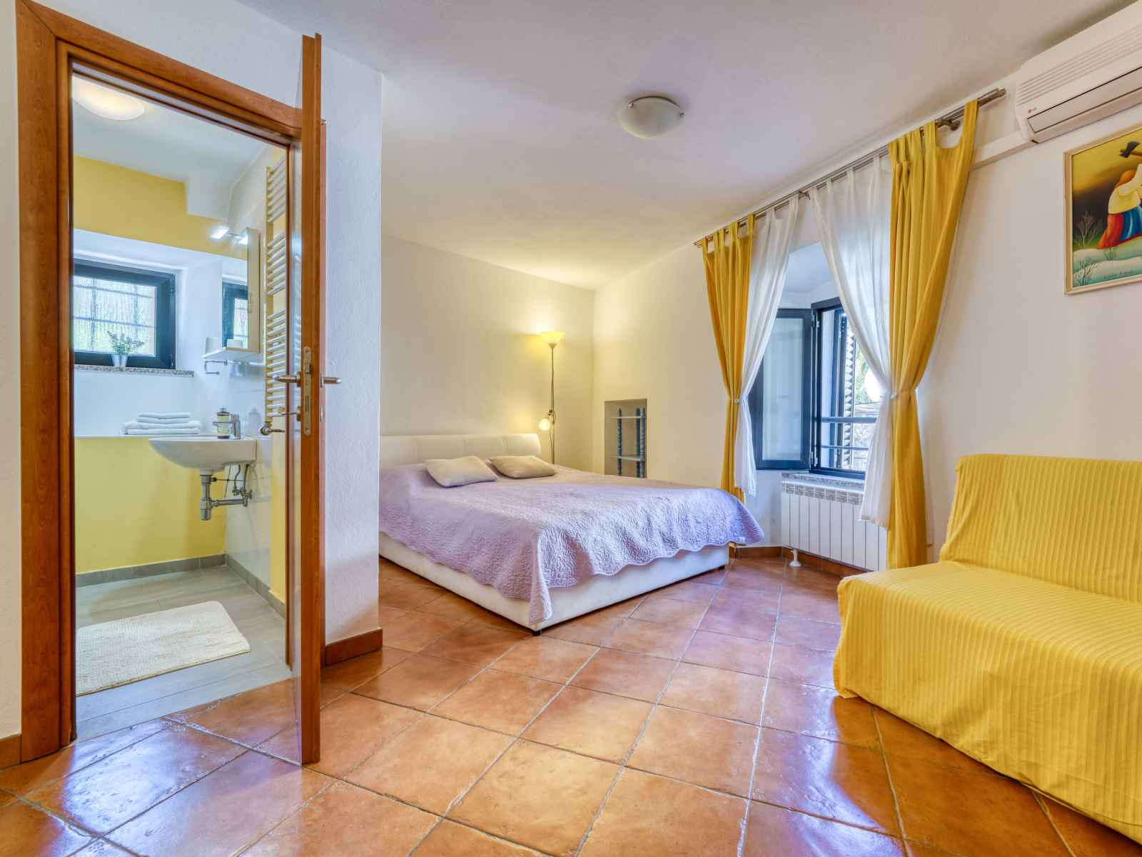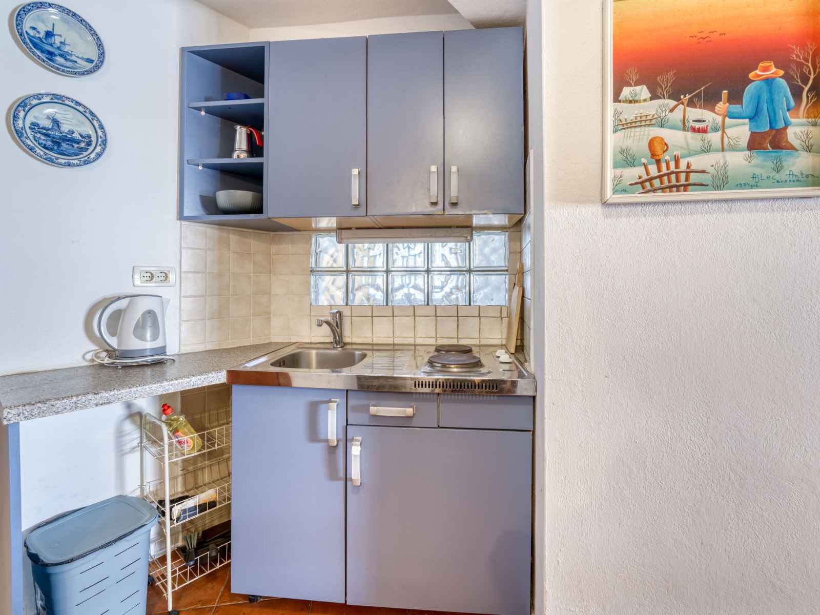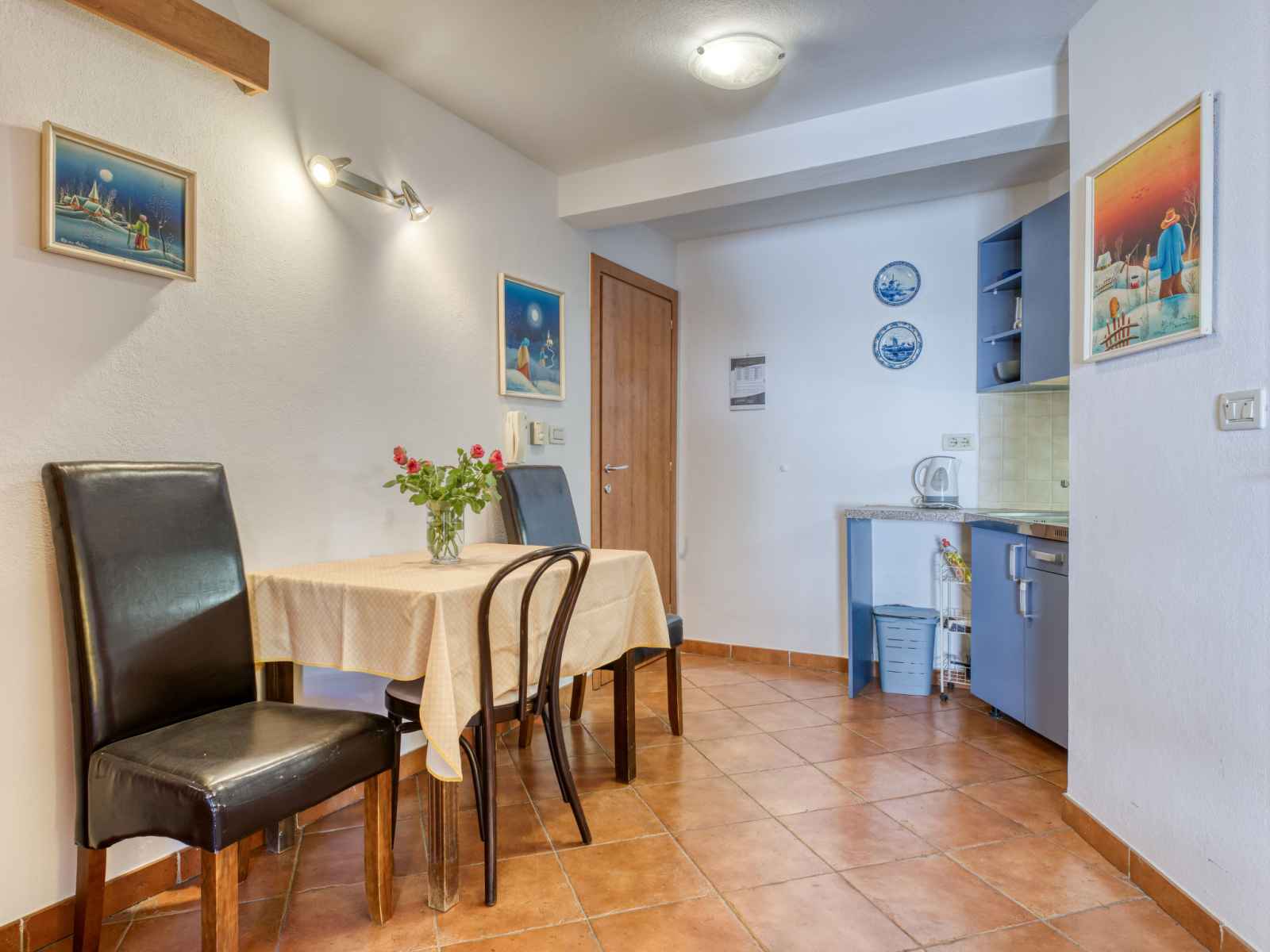 Studio 27 m2, au rez-de-chaussée. studio avec 1 divan-lit (100 cm, longueur 190 cm), 1 grand-lit (160 cm, longueur 200 cm), table pour les repas, tv (satellite) et air-conditionné. cuisine ouverte (2 plaques de cuisson, cafetière électrique). douche/wc. chauffage à air chaud. a disposition: internet (connexion wifi, gratuit).
