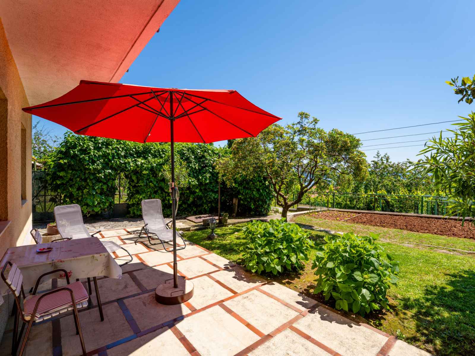 Studio 35 m2, au rez-de-chaussée, situation sud. 1 chambre avec 1 lit double (2 x 90 cm, longueur 200 cm), tv (satellite) et air-conditionné. salle à manger. sortie sur la terrasse. cuisine ouverte (4 plaques de cuisson, four, cafetière électrique). douche/wc. chauffage (en sus). terrasse 27 m2 partiellement couverte, pelouse 25 m2. meubles