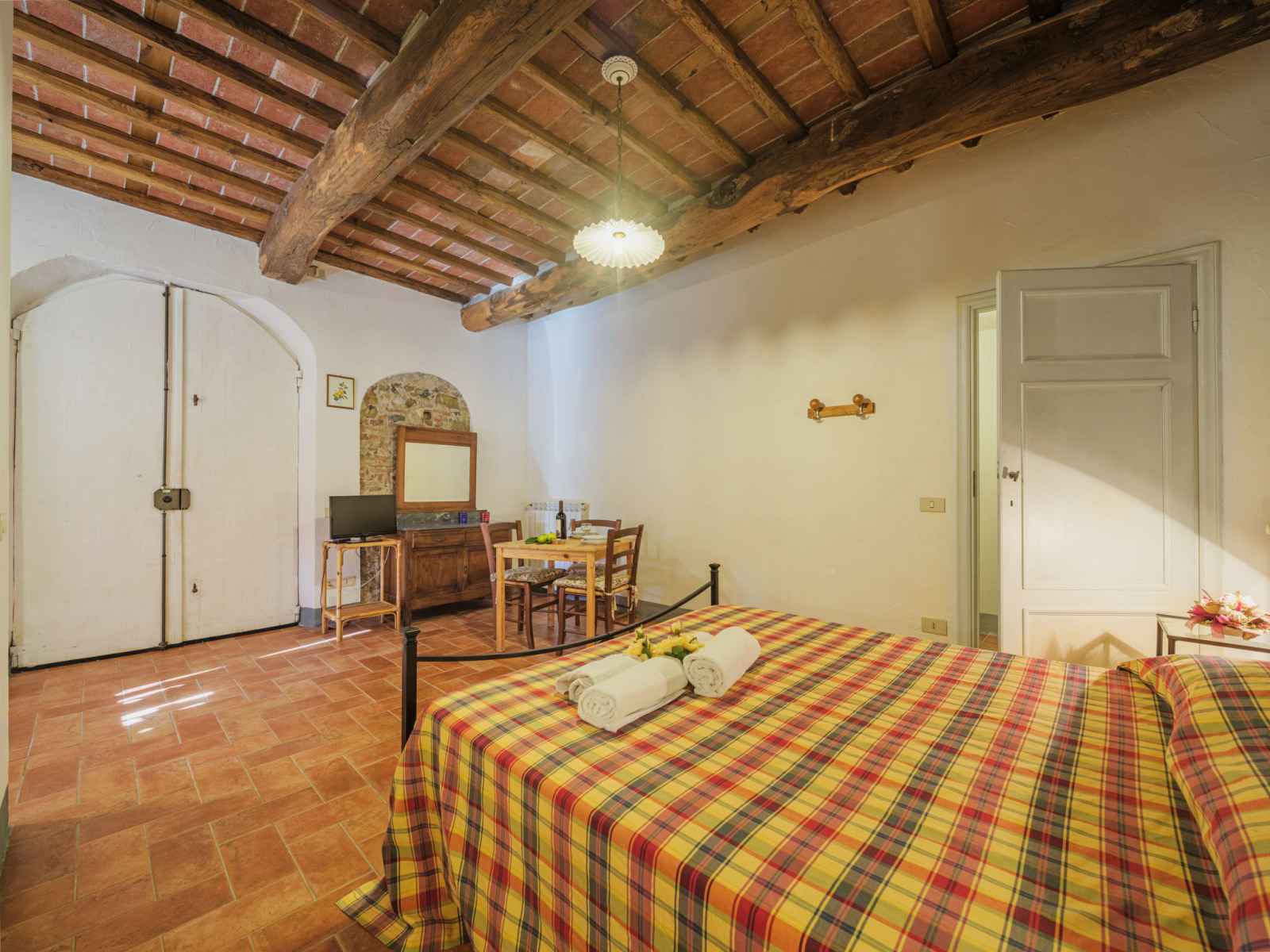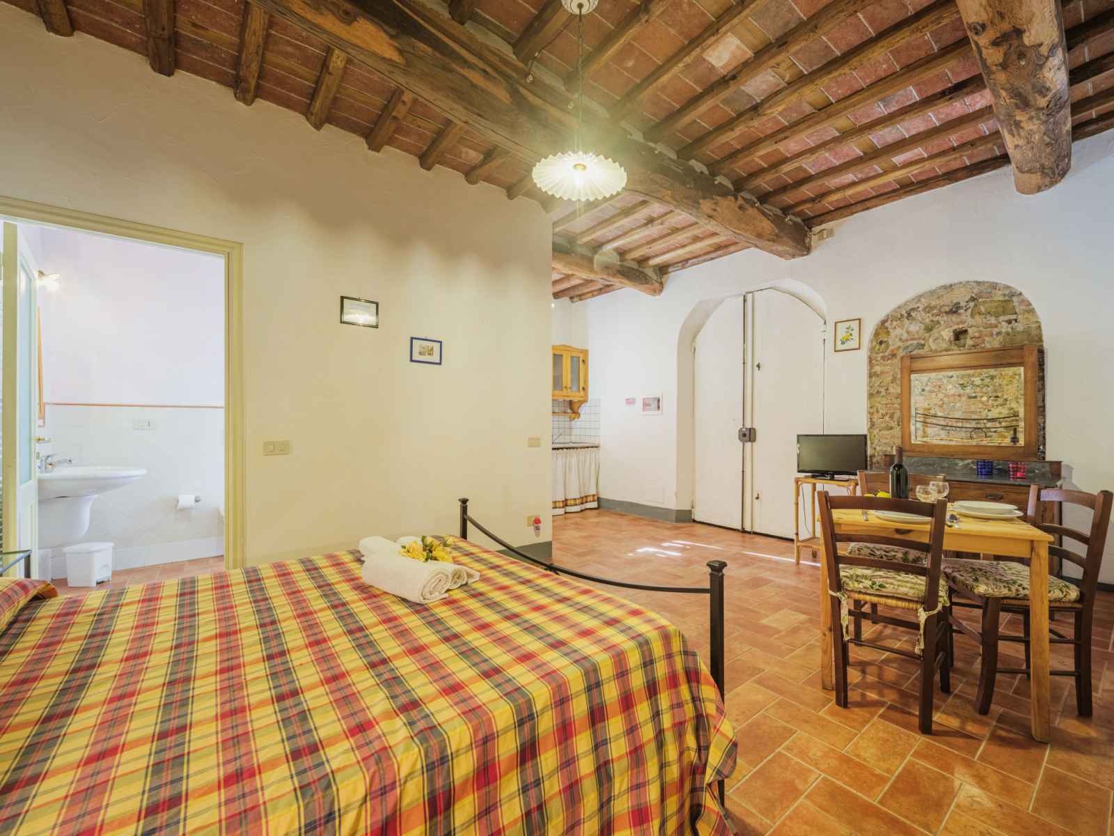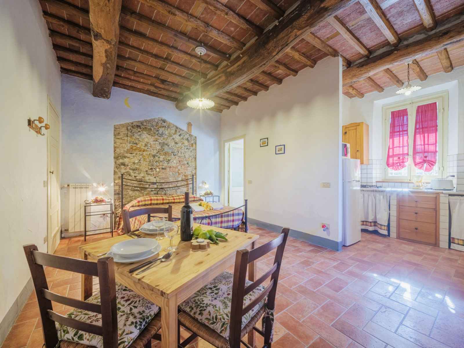 "le fornaci" studio 30 m2, au rez-de-chaussée. rénové, aménagement agréable et de bon goût: séjour/chambre à coucher avec 1 grand-lit (160 cm), table pour les repas et tv. cuisine ouverte (4 plaques de cuisson, grille-pain, micro-ondes, cafetière électrique). douche/wc. chauffage au gaz (en sus), air-conditionné (en sus). terrasse