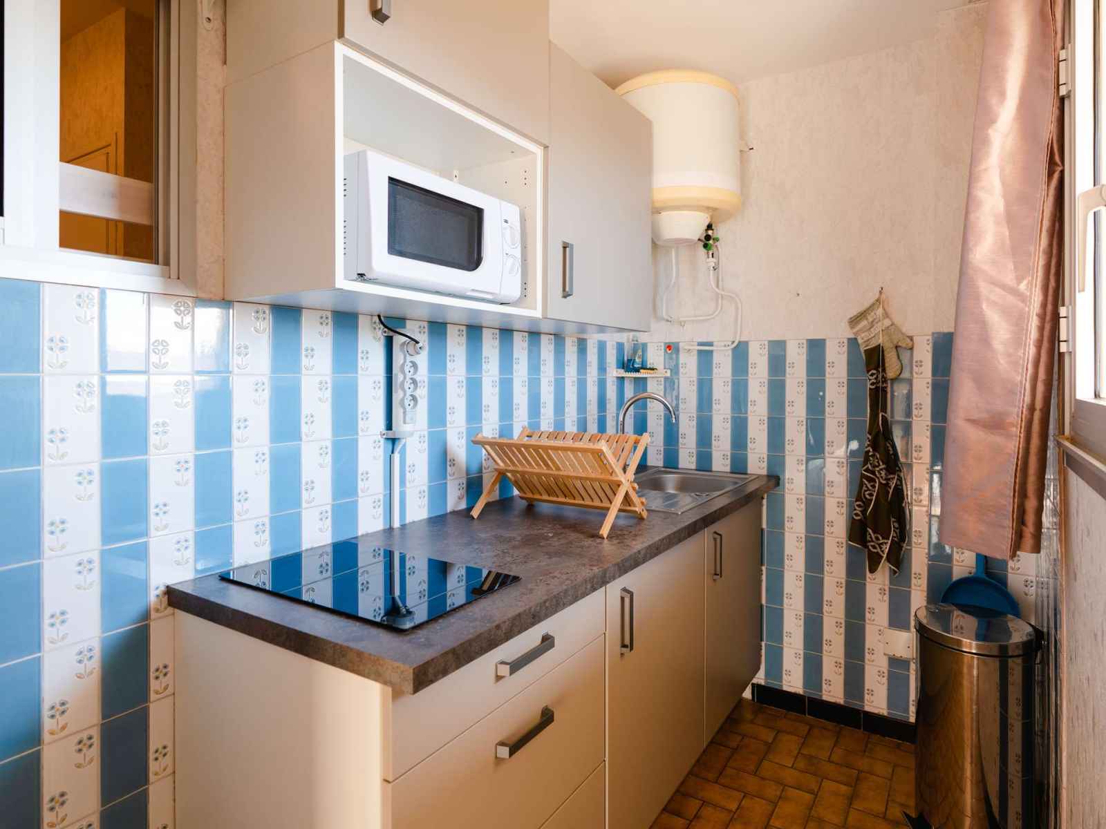 Cuisine aménagée et équipée comprenant : plaque de cuisson vitrocéramique, cafetière électrique classique, bouilloire, micro-ondes, réfrigérateur, petit congélateur, etc.) donnant sur salon avec télévision (chaines françaises uniquement). Couchage dans le salon sous la forme d'un lit rabattable en 140x190cm.