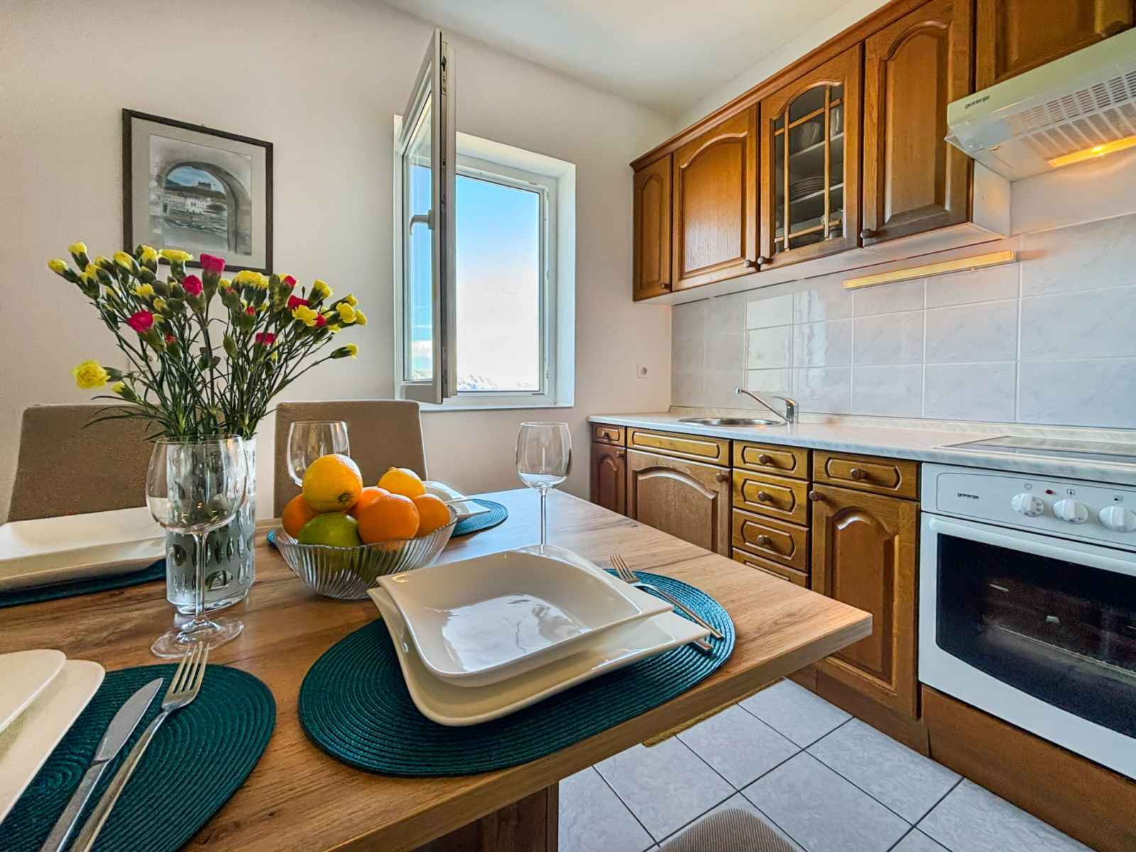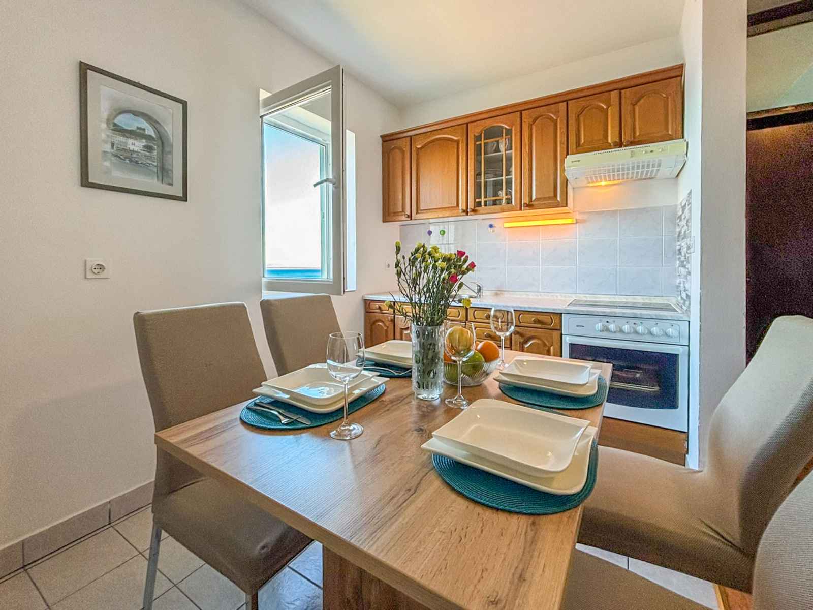 "sea&mount 1" studio 47 m2 au 2ème étage. séjour/chambre à coucher avec 1 grand-lit (160 cm, longueur 190 cm), tv (satellite) et air-conditionné. sortie sur la loggia. cuisine (four, 4 plaques vitrocéramiques, grille-pain, bouilloire électrique, congélateur, cafetière électrique) avec table pour les repas. bain/wc. pas de chauffage.