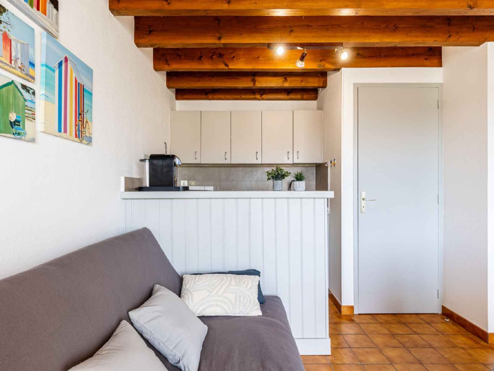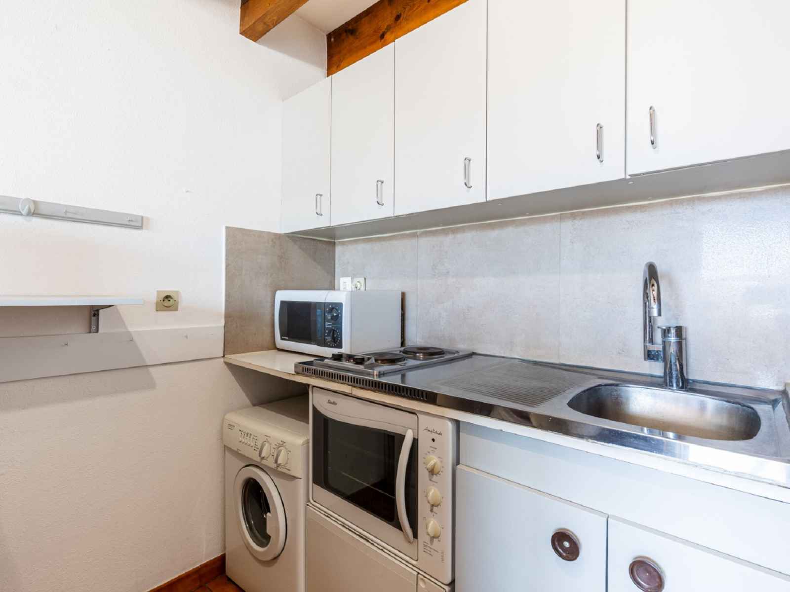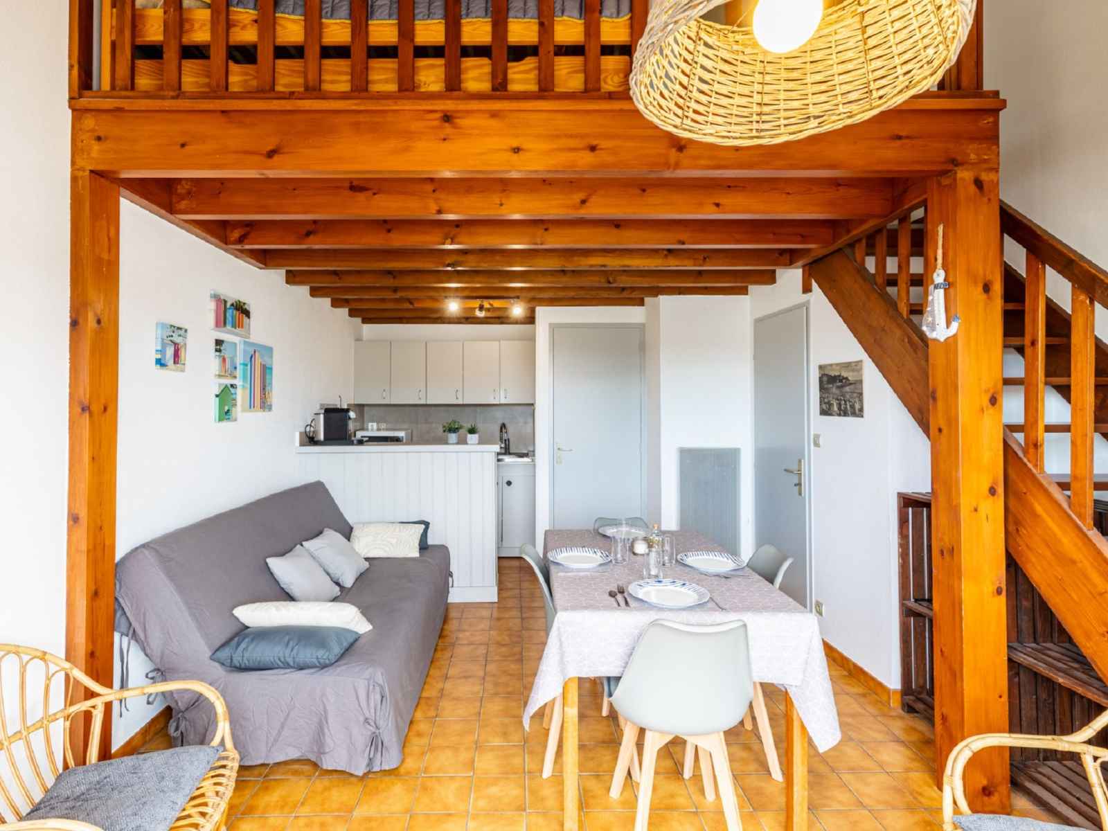 Studio 32 m2 sur 2 niveaux au 1er étage. aménagement fonctionnel: séjour/salle à manger avec 1 divan-lit double (1 x 140 cm, longueur 190 cm), tv (écran plat). sortie sur la terrasse. coin cuisine (2 plaques de cuisson, mini-four, lave-vaisselle, bouilloire électrique, micro-ondes, cafetière électrique). wc séparé. chauffage électrique.