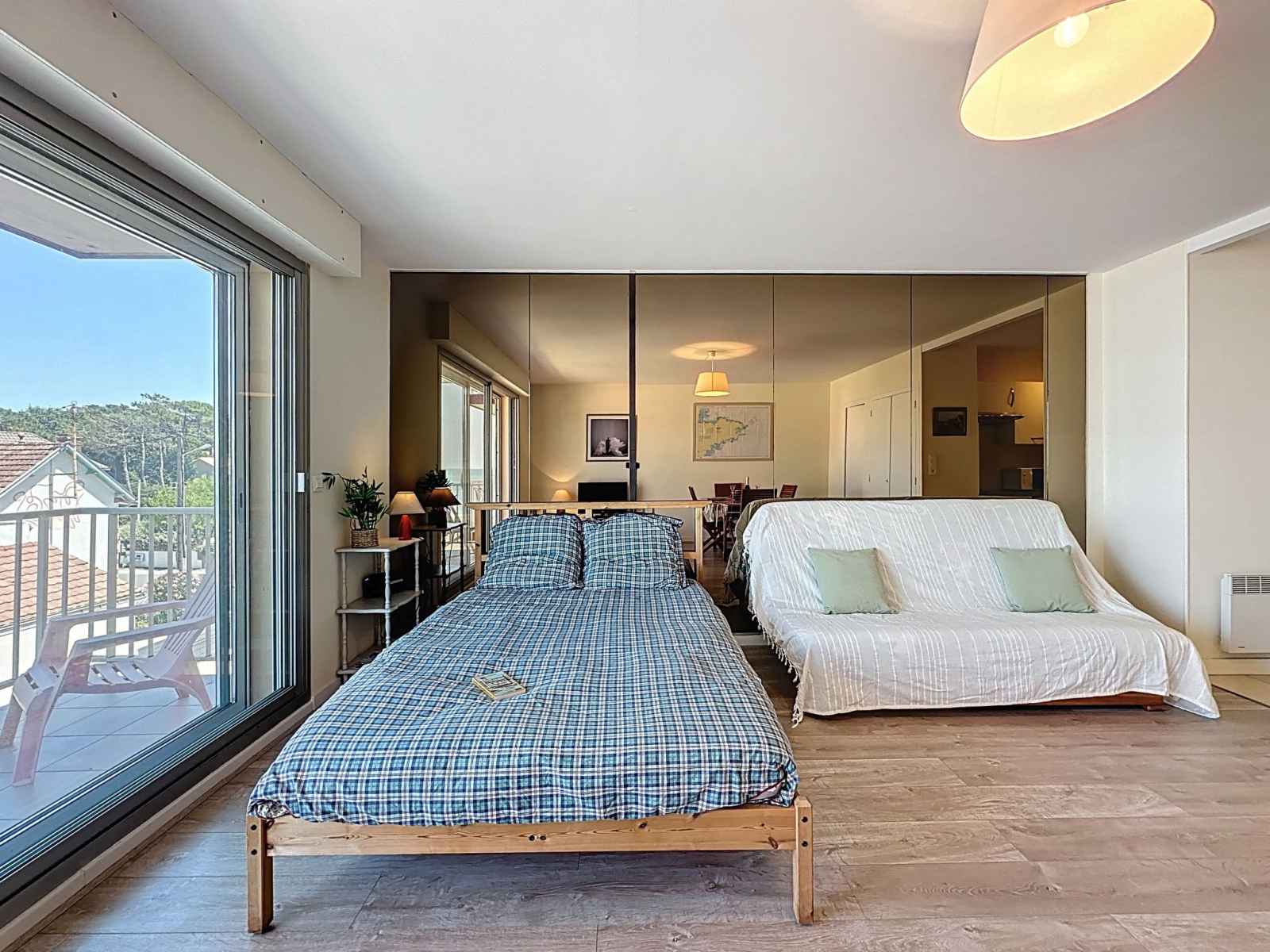 Studio 30 m2 au 2ème étage. aménagement agréable: séjour/chambre à coucher avec 1 grand-lit (140 cm, longueur 190 cm), tv (écran plat). sortie sur le balcon. cuisine ouverte (four, 4 plaques vitrocéramiques, grille-pain, bouilloire électrique, micro-ondes, cafetière électrique). douche/wc. chauffage électrique. balcon 4 m2. mobilier de
