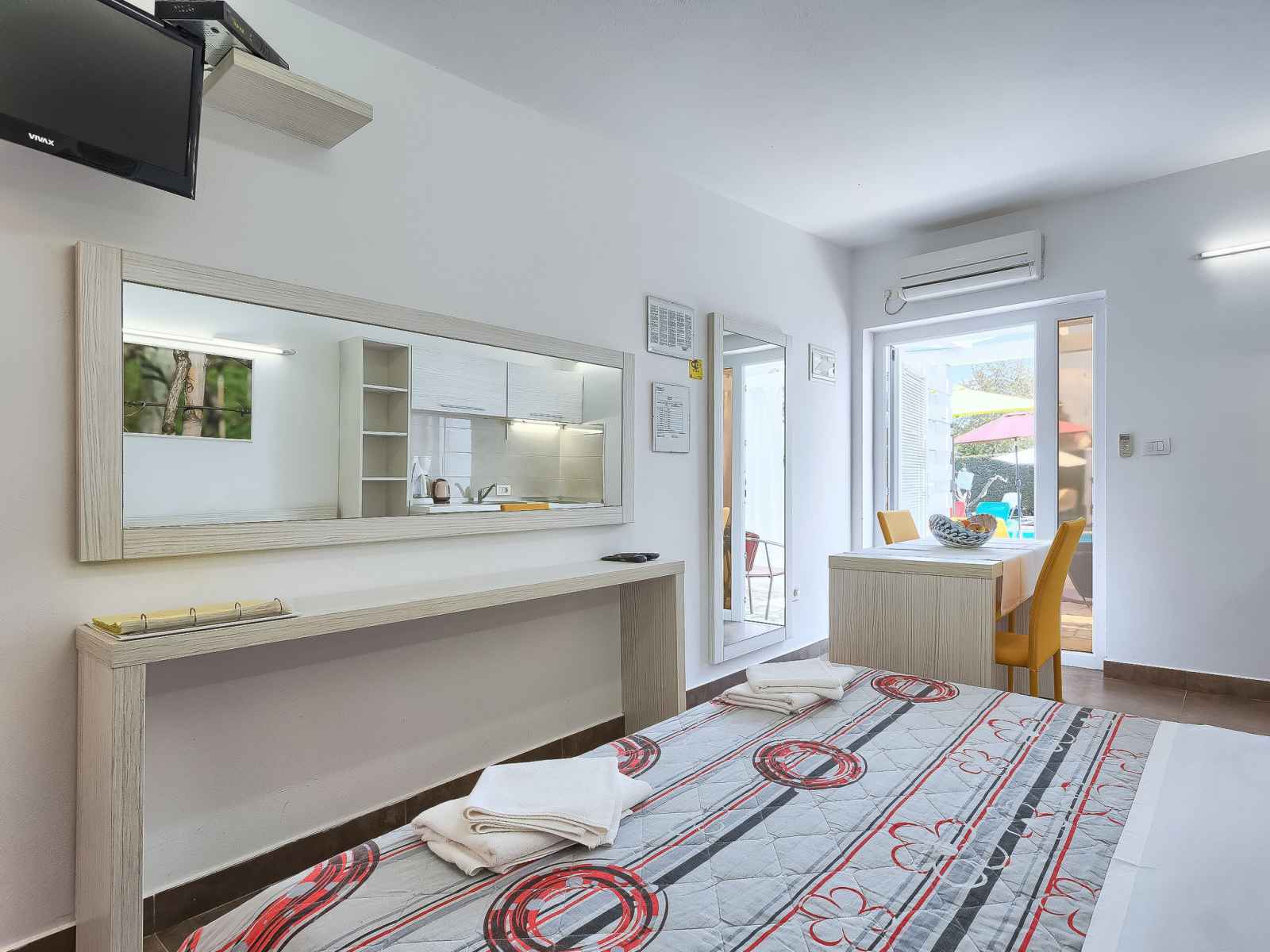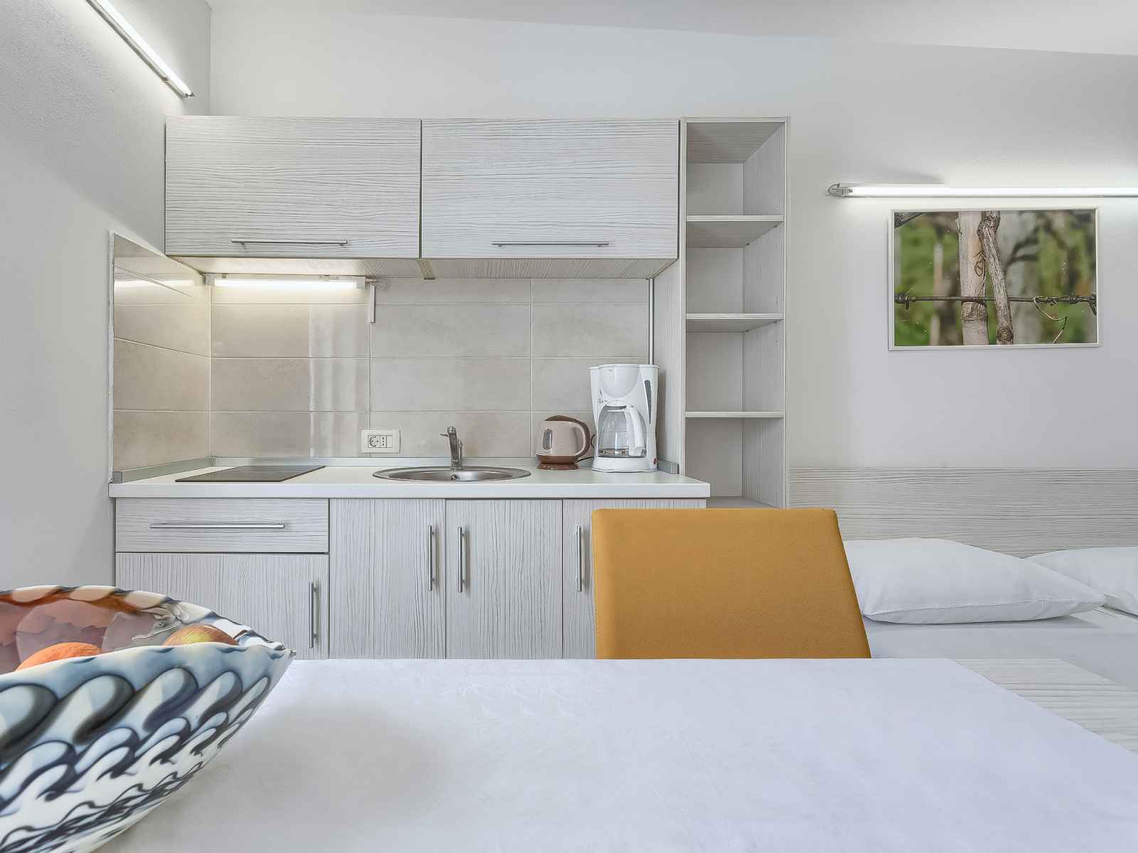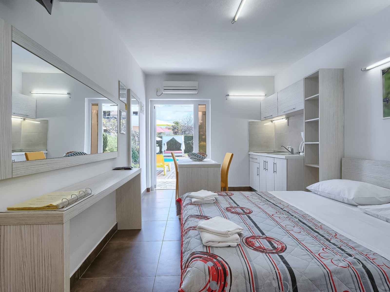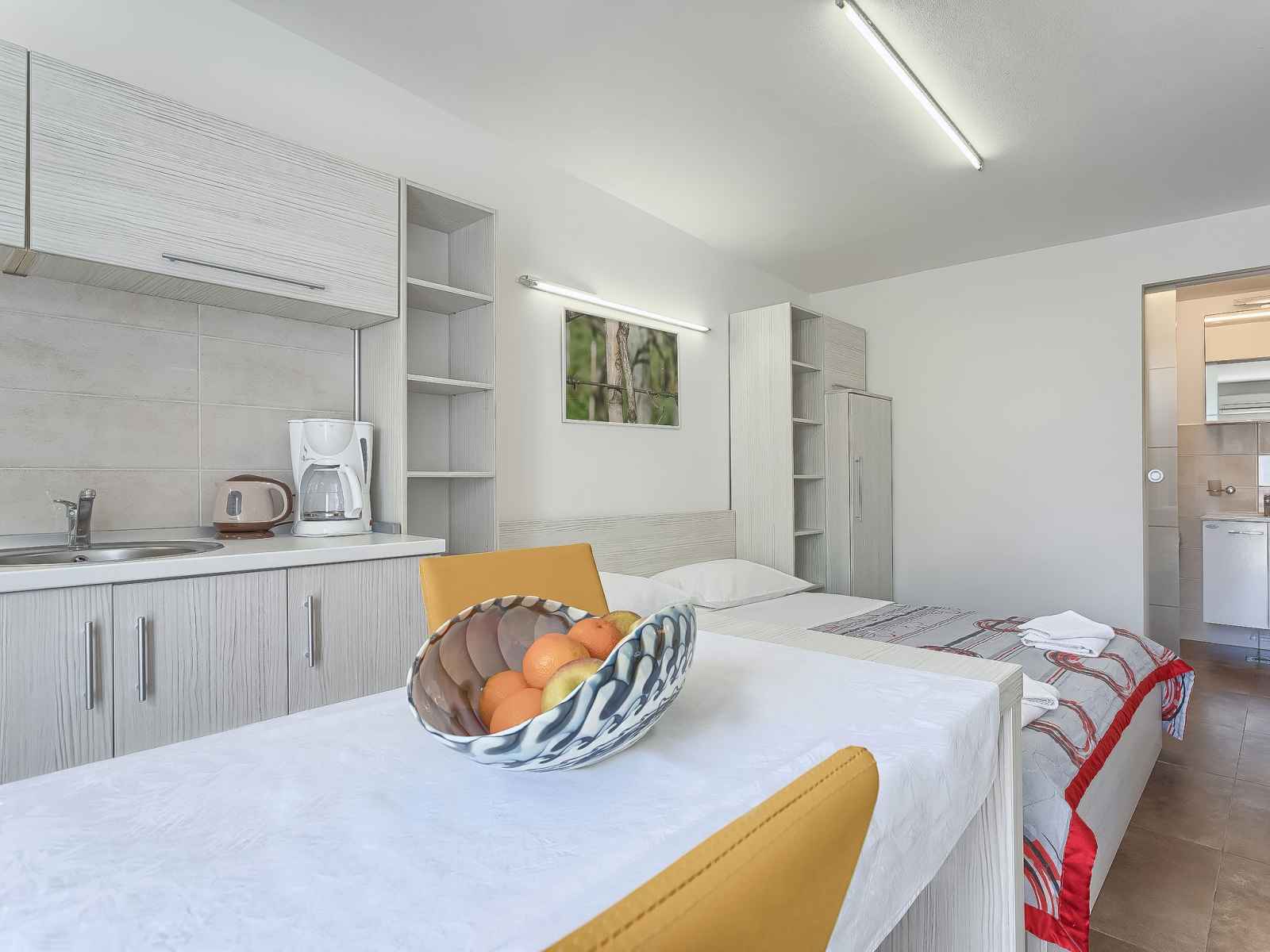 Studio 18 m2, au rez-de-chaussée. studio avec 1 grand-lit (160 cm, longueur 200 cm), tv (satellite) (écran plat), air-conditionné. sortie sur la terrasse, sur la piscine. cuisine ouverte (2 plaques vitrocéramiques, micro-ondes) avec table pour les repas. douche/wc. terrasse 6 m2, couverte. meubles de terrasse. vue sur la piscine. a