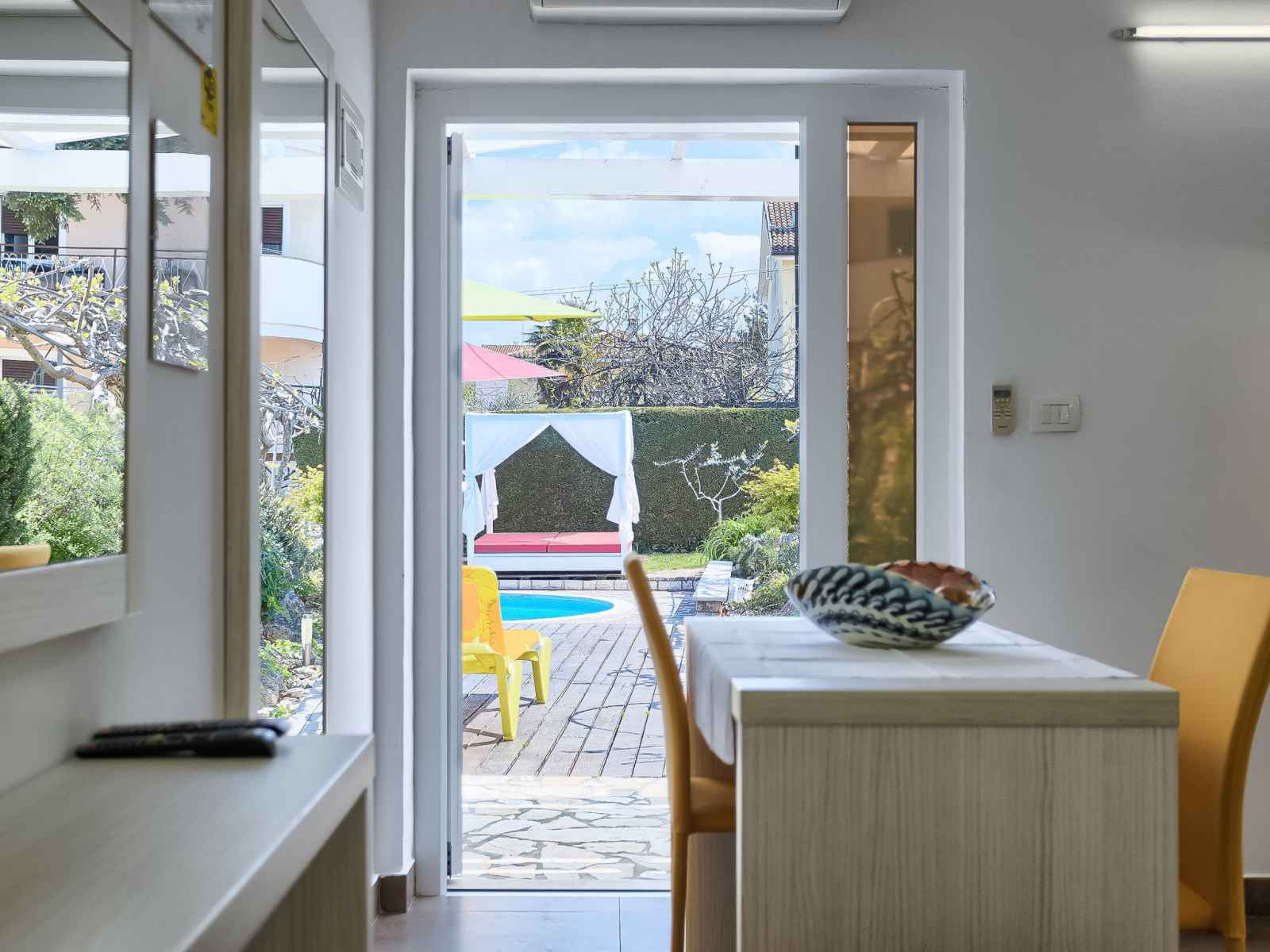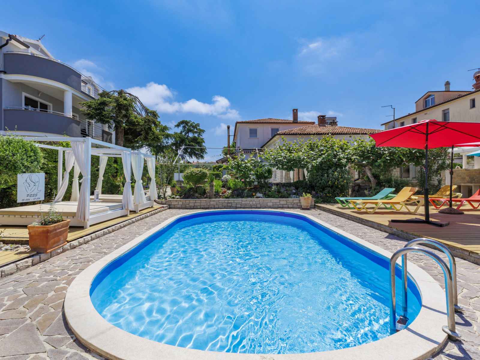 Immeuble "nika". dans le quartier de punta, à 2 km du centre d'umag, situation ensoleillée, à 300 m de la mer, à 300 m de la plage. en commun: terrain 1'500 m2 (clôturé), jardin entretenu, piscine (8 x 4 m, profondeur 135 cm, disponibilité saisonnière: 25.avr. - 19.sep.). douche extérieure, bain à remous , barbecue. infrastructures de