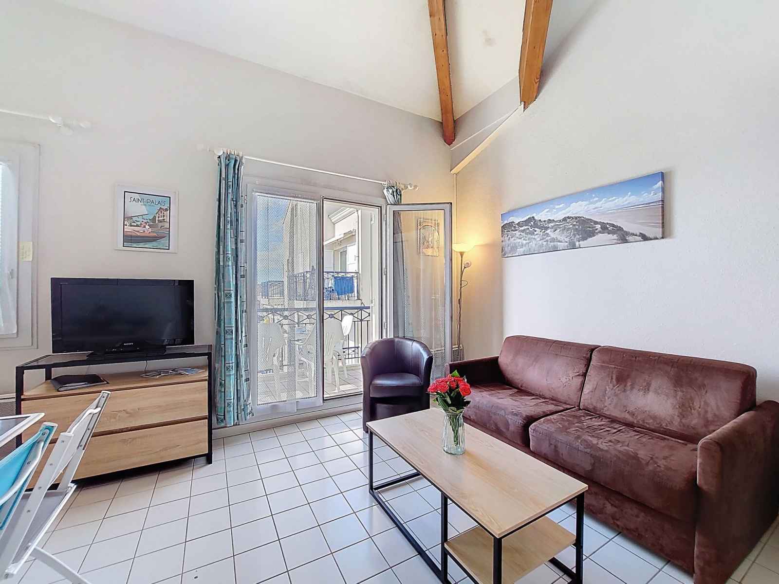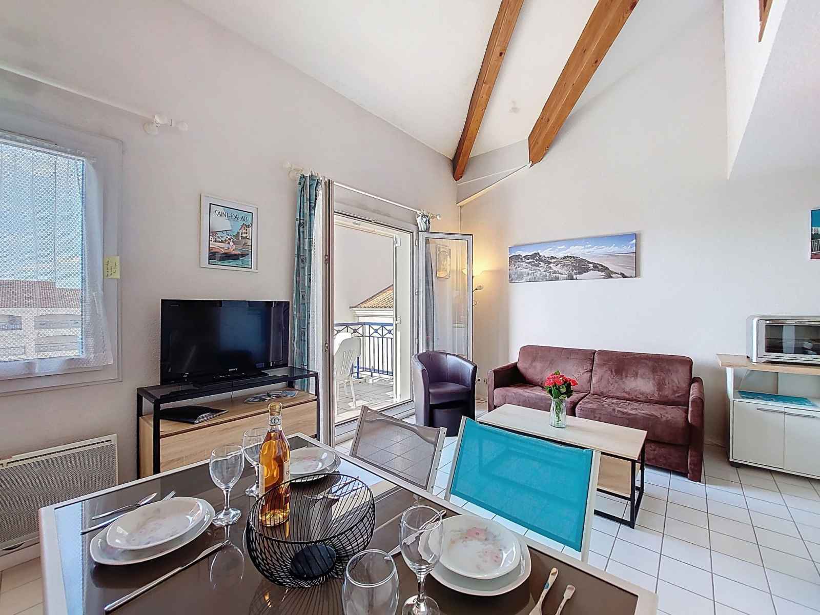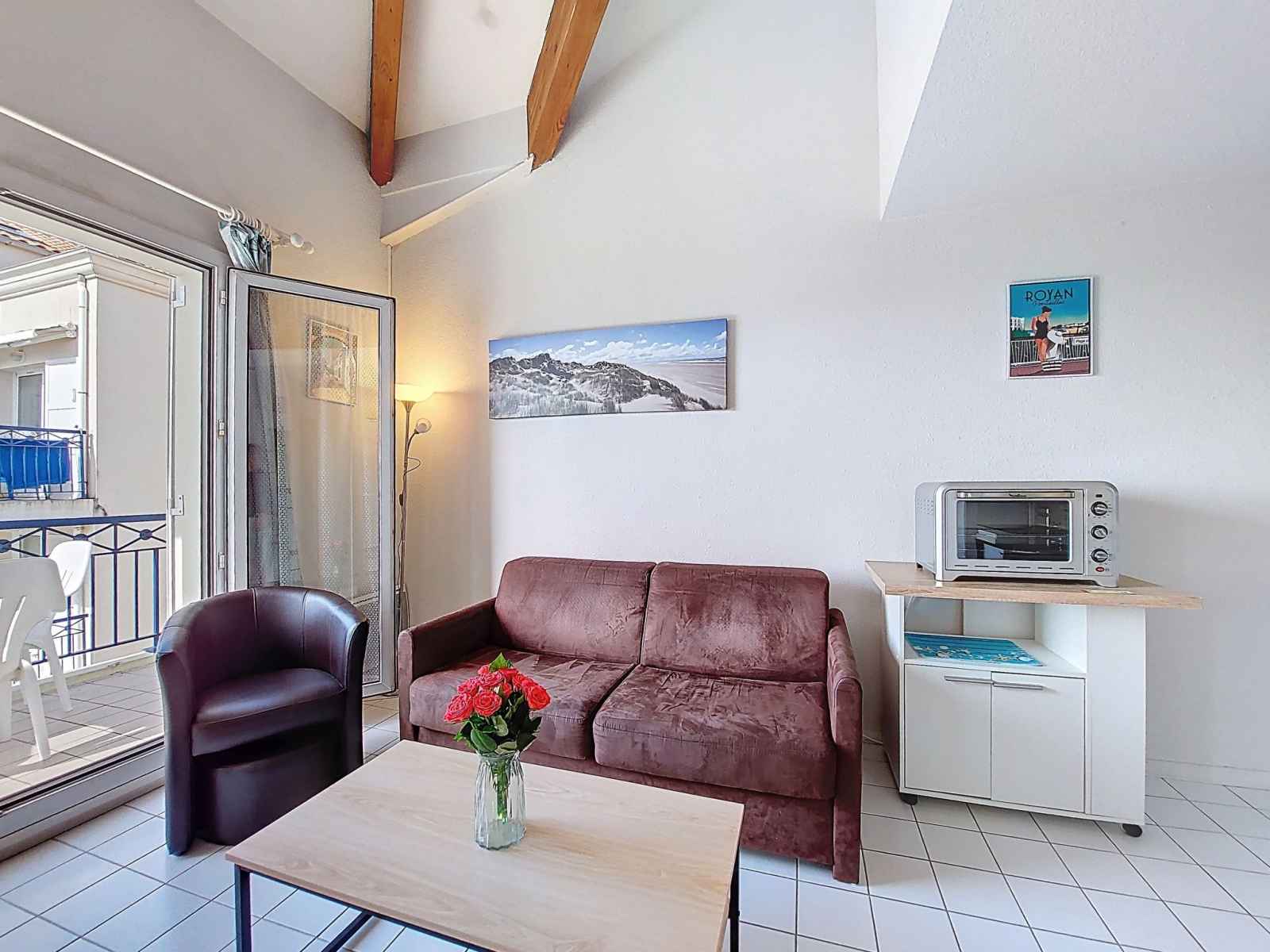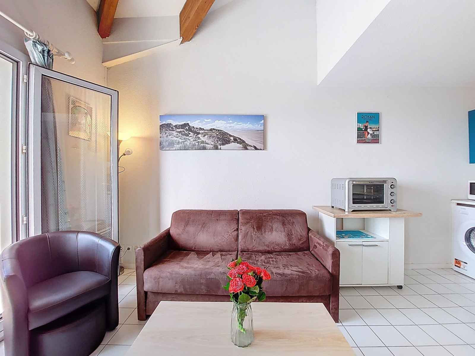 Studio 32 m2 sur 2 niveaux au 4ème étage, situation sud-ouest. séjour avec 1 divan-lit double (1 x 140 cm, longueur 190 cm), tv (écran plat). sortie sur le balcon. coin cuisine (2 plaques de cuisson, four, micro-ondes, cafetière électrique). salle de bains, wc séparé. chauffage électrique. À l'étage supérieur: (escalier raide) galerie